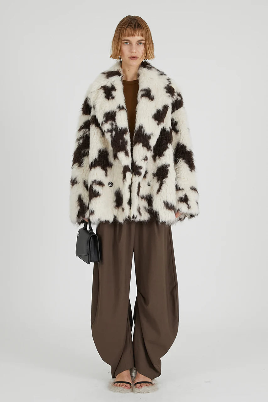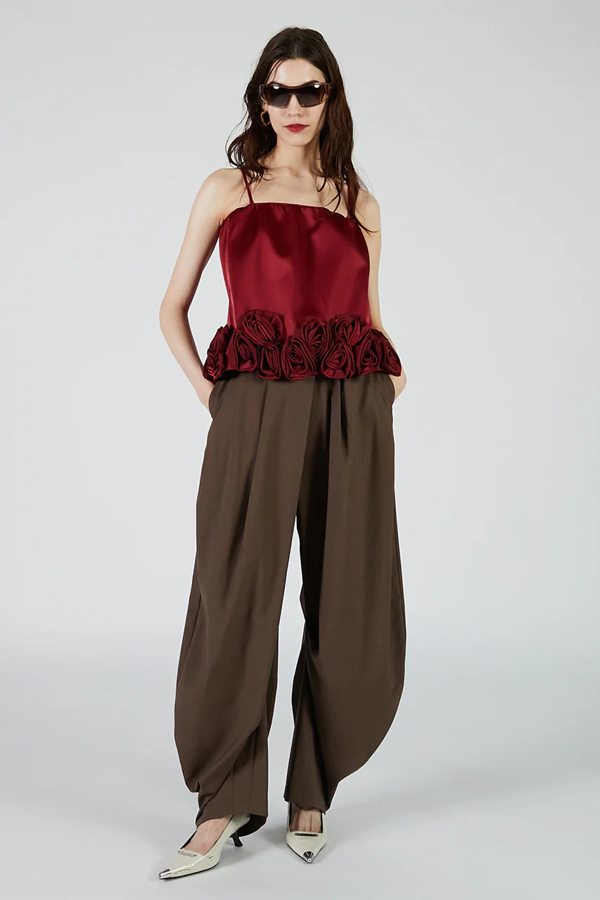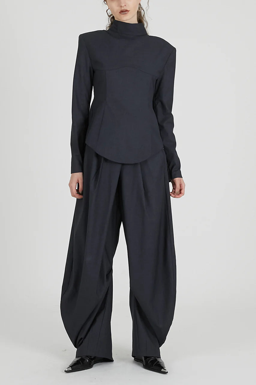 立体的なカーブシルエットとアシンメトリーなドレープが目を惹くモード感漂うパンツ。