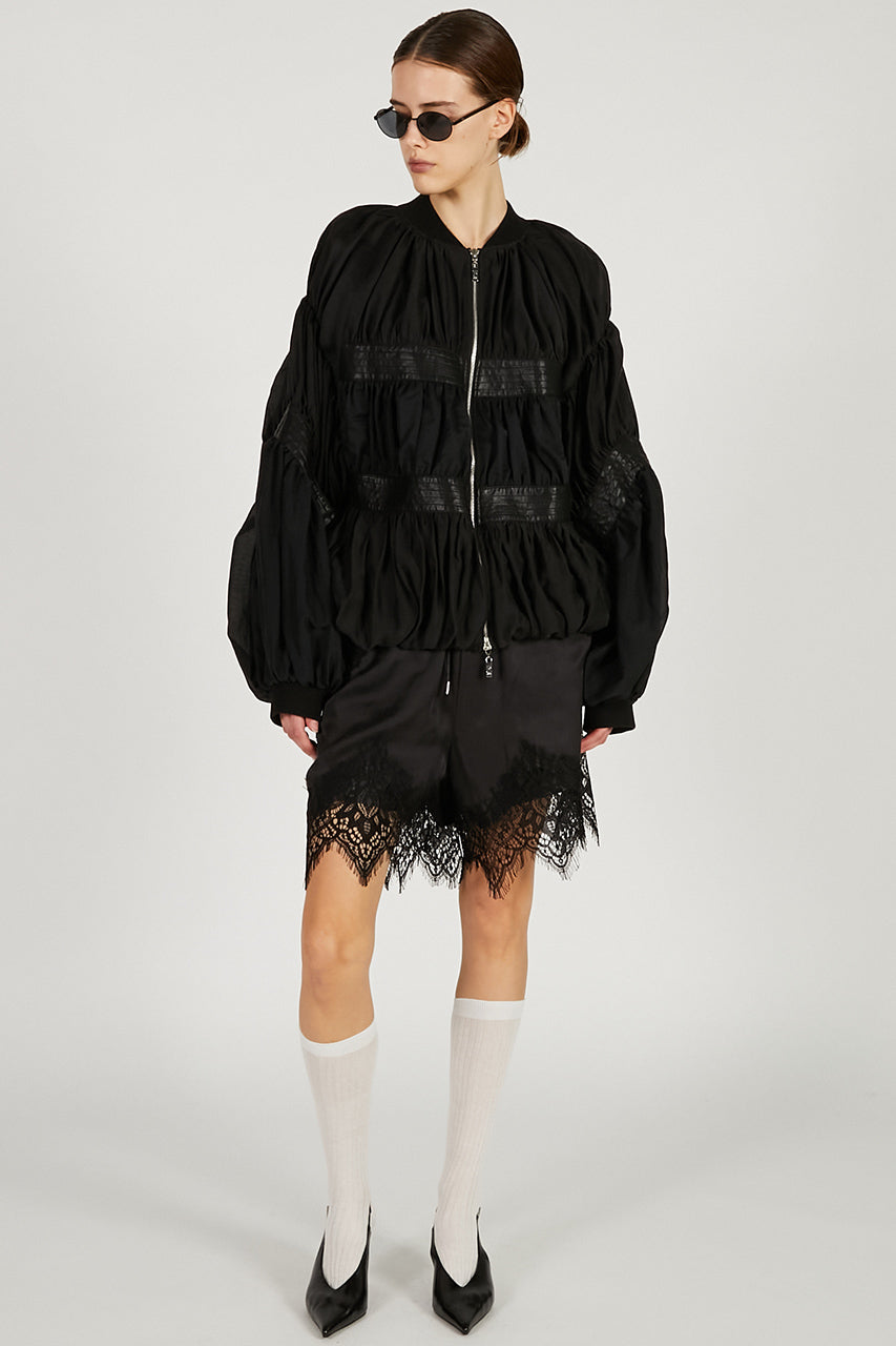 存在感のあるギャザーと異素材の切替ディテールが印象的なブルゾン。