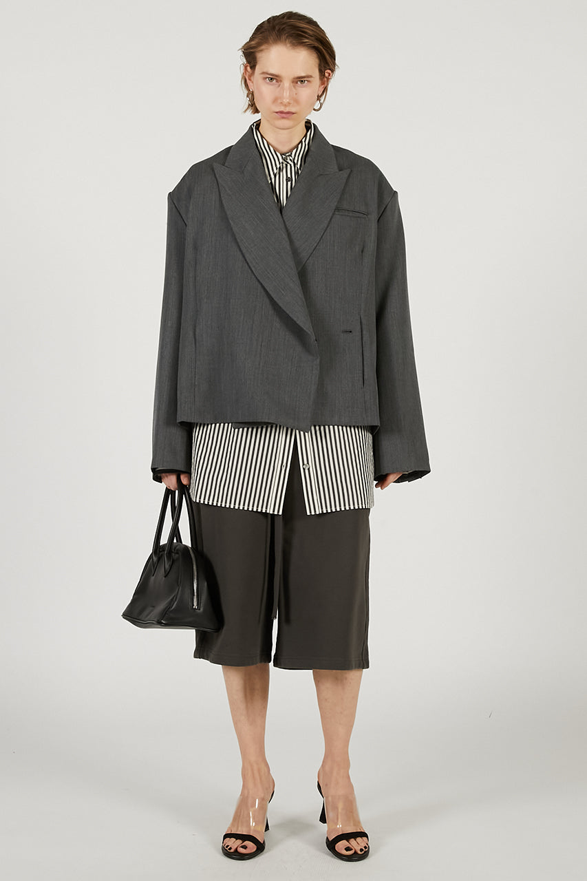 肩の落ちたリラックスシルエットと、やや長めのカフスが洗練された印象を与えてくれる。