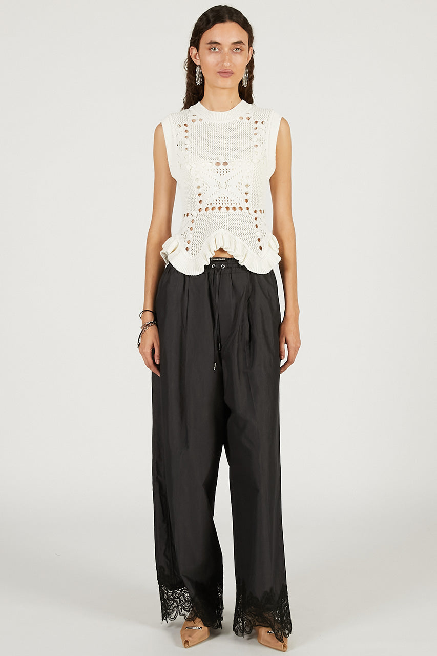 立体感のあるモチーフパターンが印象的なニットベスト。クラフトライクな表情のある編み柄で一枚で着映えするアイテム。前後で着用可能な2way仕様。フロントのリボンを開ければ羽織りとしても着ていただけるデザイン。コンパクトシルエットでジャケットのインナーやカットソーとのレイヤードでロングシーズン活躍するニット。