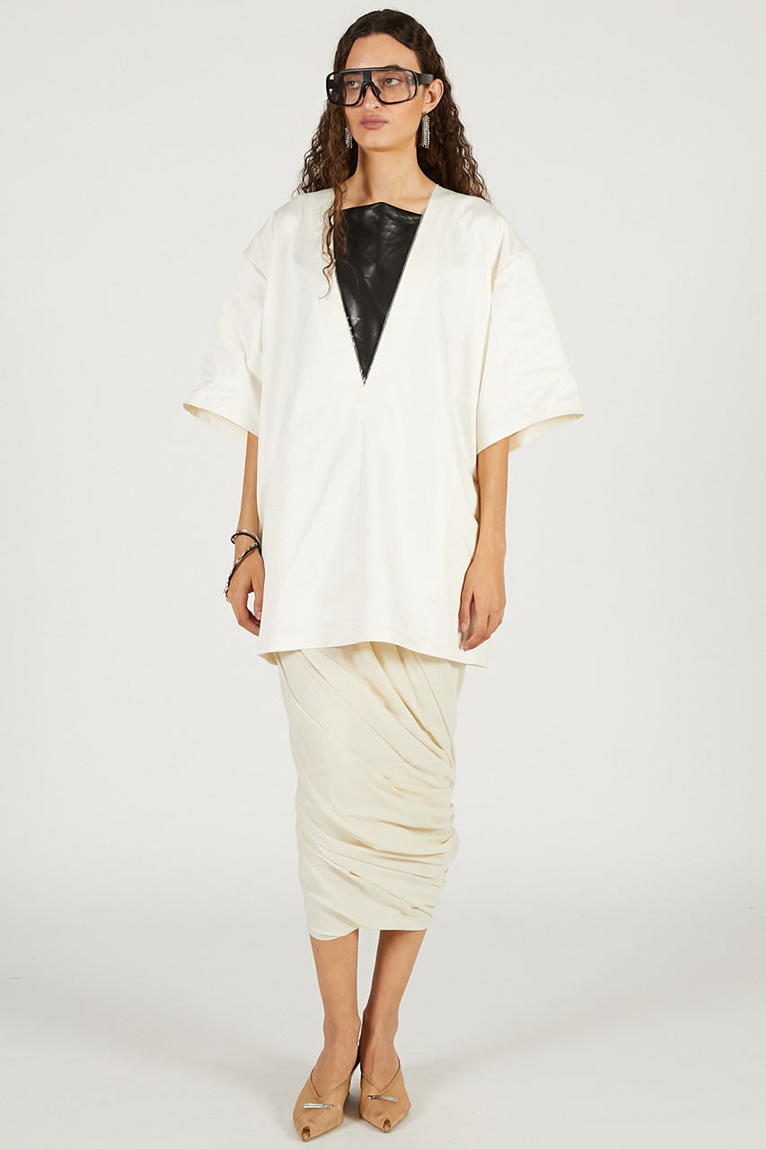 深いVネックのカッティングがモードなレザーライクオーバーT。シャツやレースキャミなどのレイヤードや、チノパンツなどのボトムスとも相性◎。