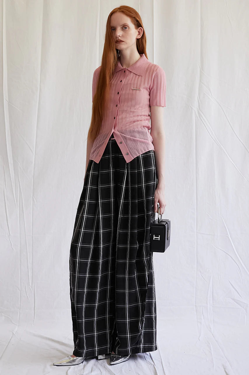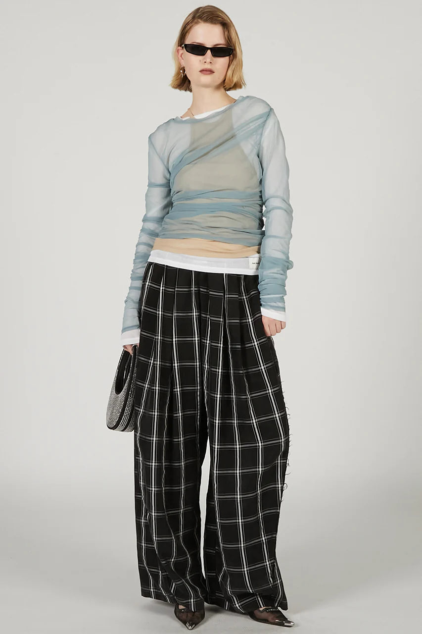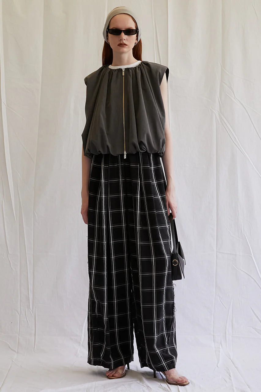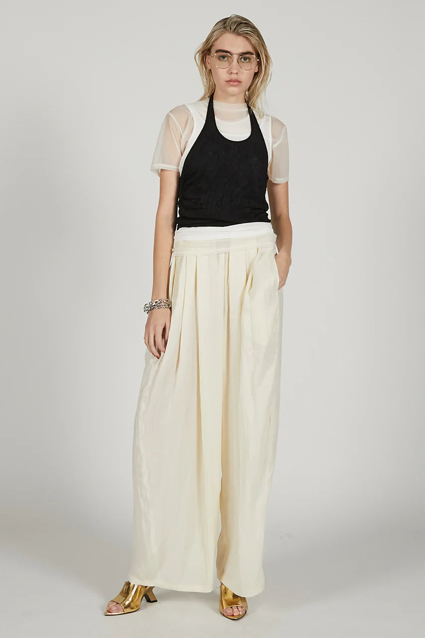 たっぷりと入れたギャザーのボリューム感がポイントのワイドパンツ。