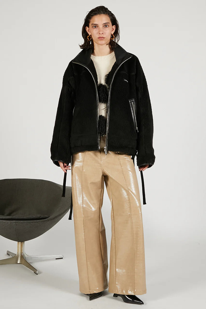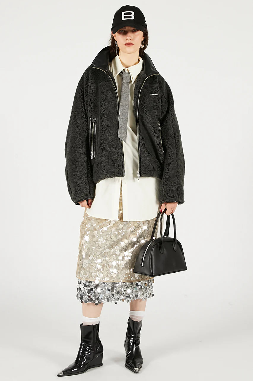 メタルファスナーやフェイクレザーのトリミングでエッジを効かせているのもポイント。