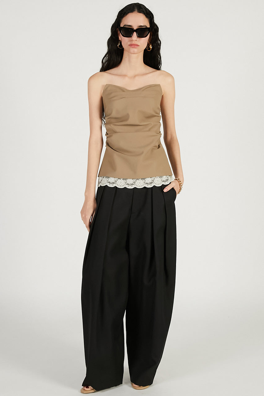 程よいハリ感を持つ素材で仕立てたワイドシルエットのトラウザー。