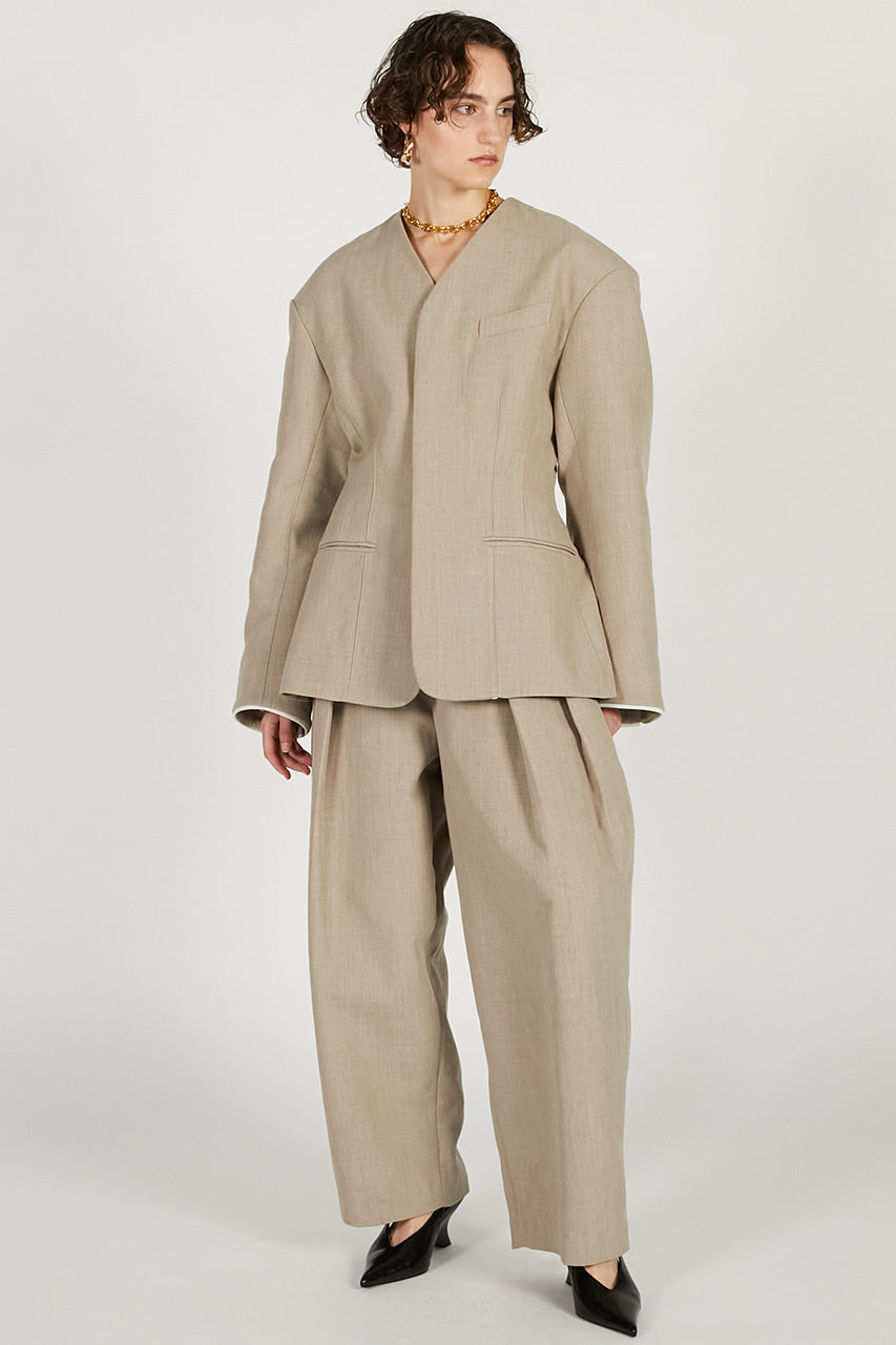 深めのタックが生み出す立体的な丸みのあるフォルムが、モードな存在感を演出。