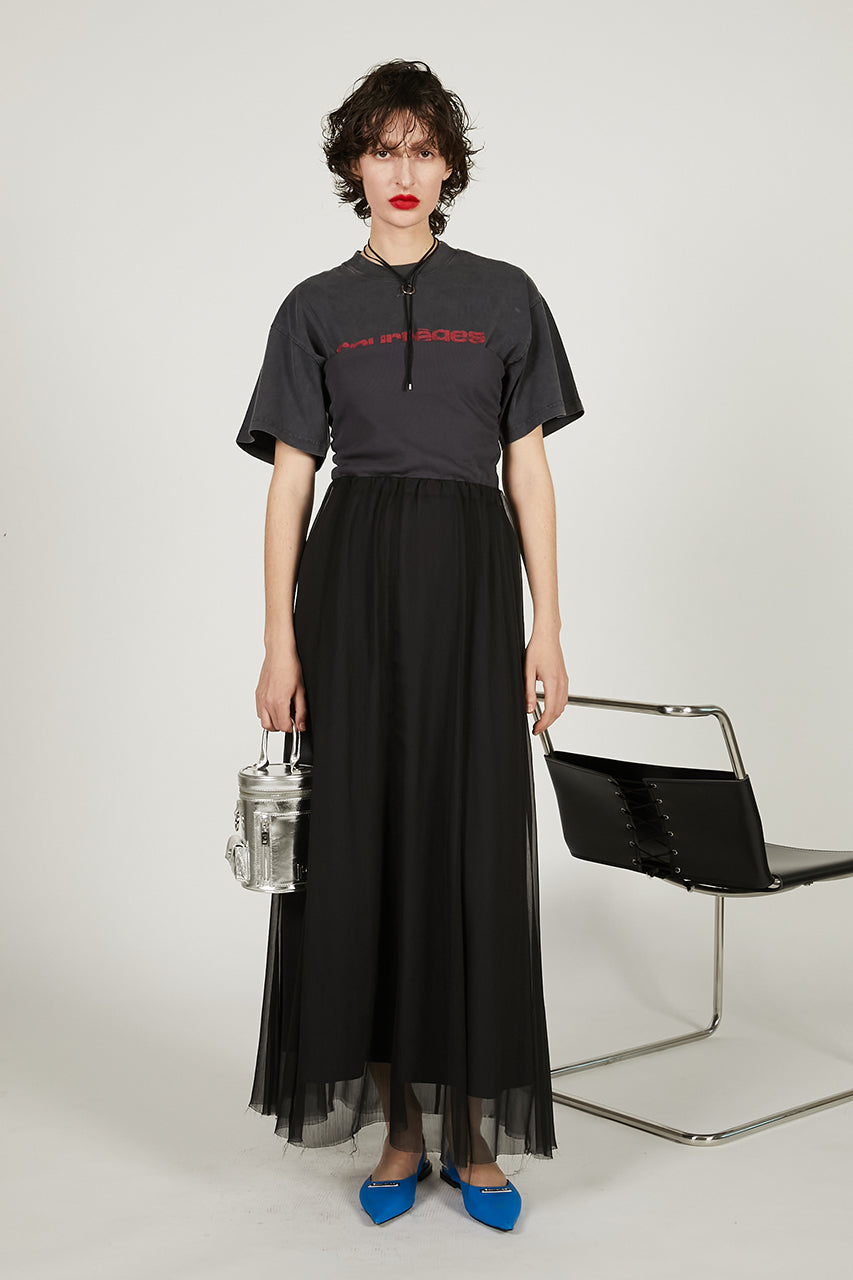 リブのカットソーにシフォンをレイヤードし、リバーシブルで違う表情を楽しめる優秀アイテム。