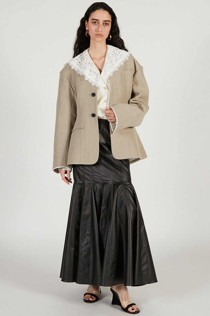 麻ライクな表情の程良い抜け感とハリ感がモードな印象に。