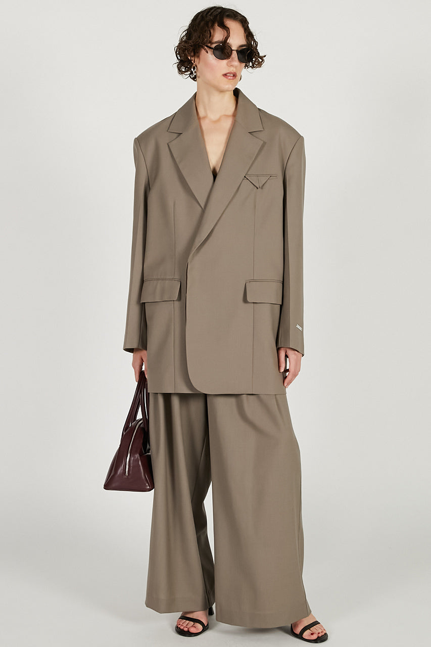 同素材のダブルウエストスラックスとのセットアップスタイルも可能。