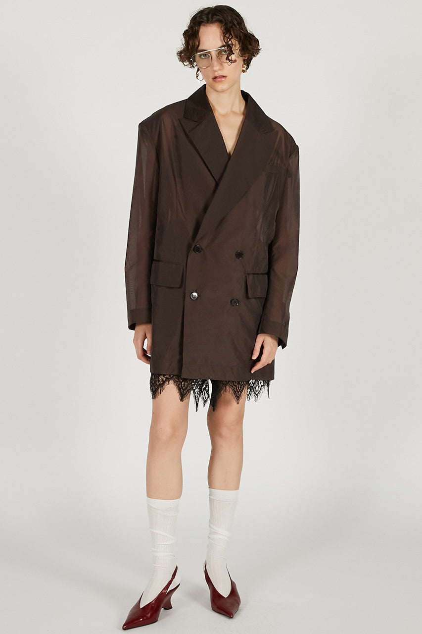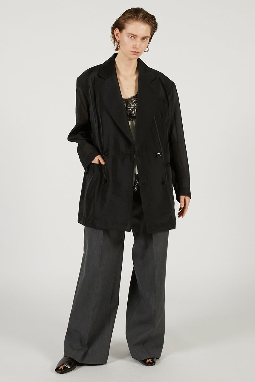 ゆとりのあるオーバーシルエットが抜け感を演出し、インナーとのレイヤードも自在に楽しめる一着。