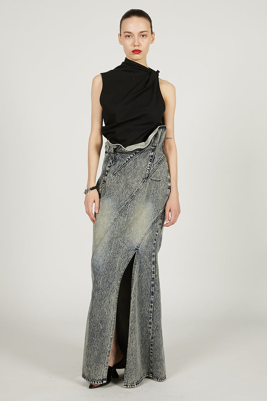 胸の上部中央に AC ロゴが入った、袖なしのドレープ ジャージー トップ。