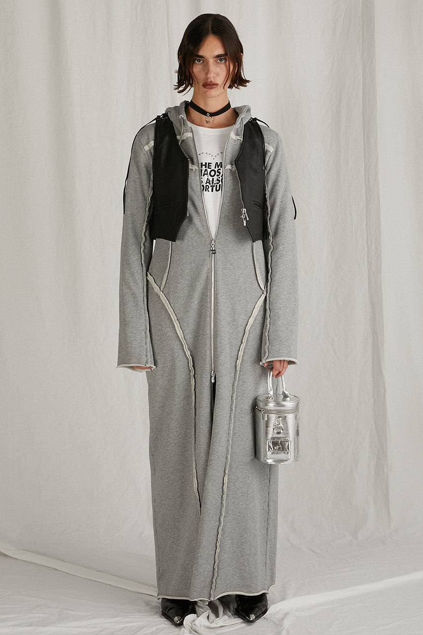フロントのファスナーを開けて、ボトムスをチラ見せしたスタイルやロングカーディガン感覚で羽織としても重宝するアイテム。