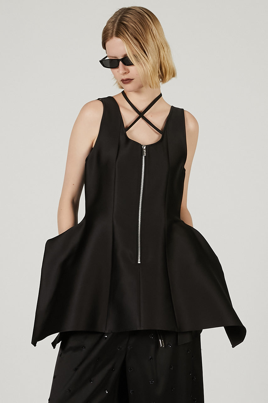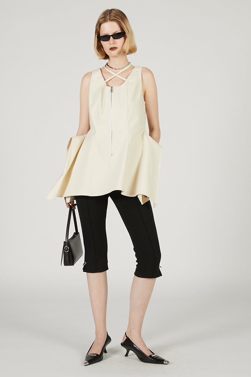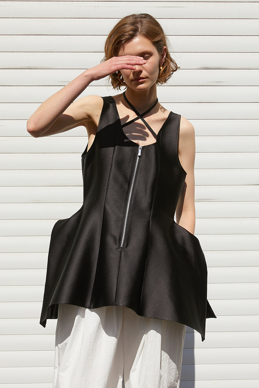 ウエスト周りをスクエアに協調した遊び心あふれる構築的なシルエットがデザインポイント。