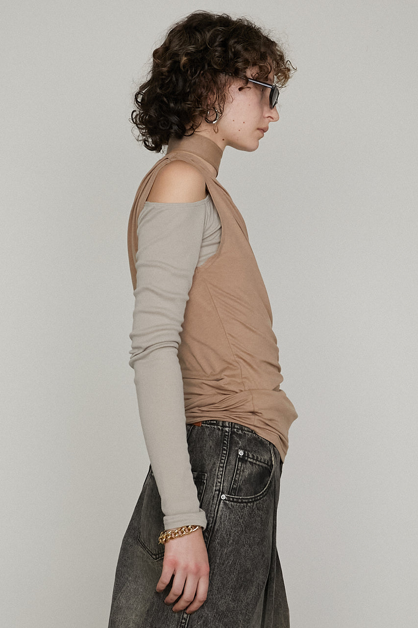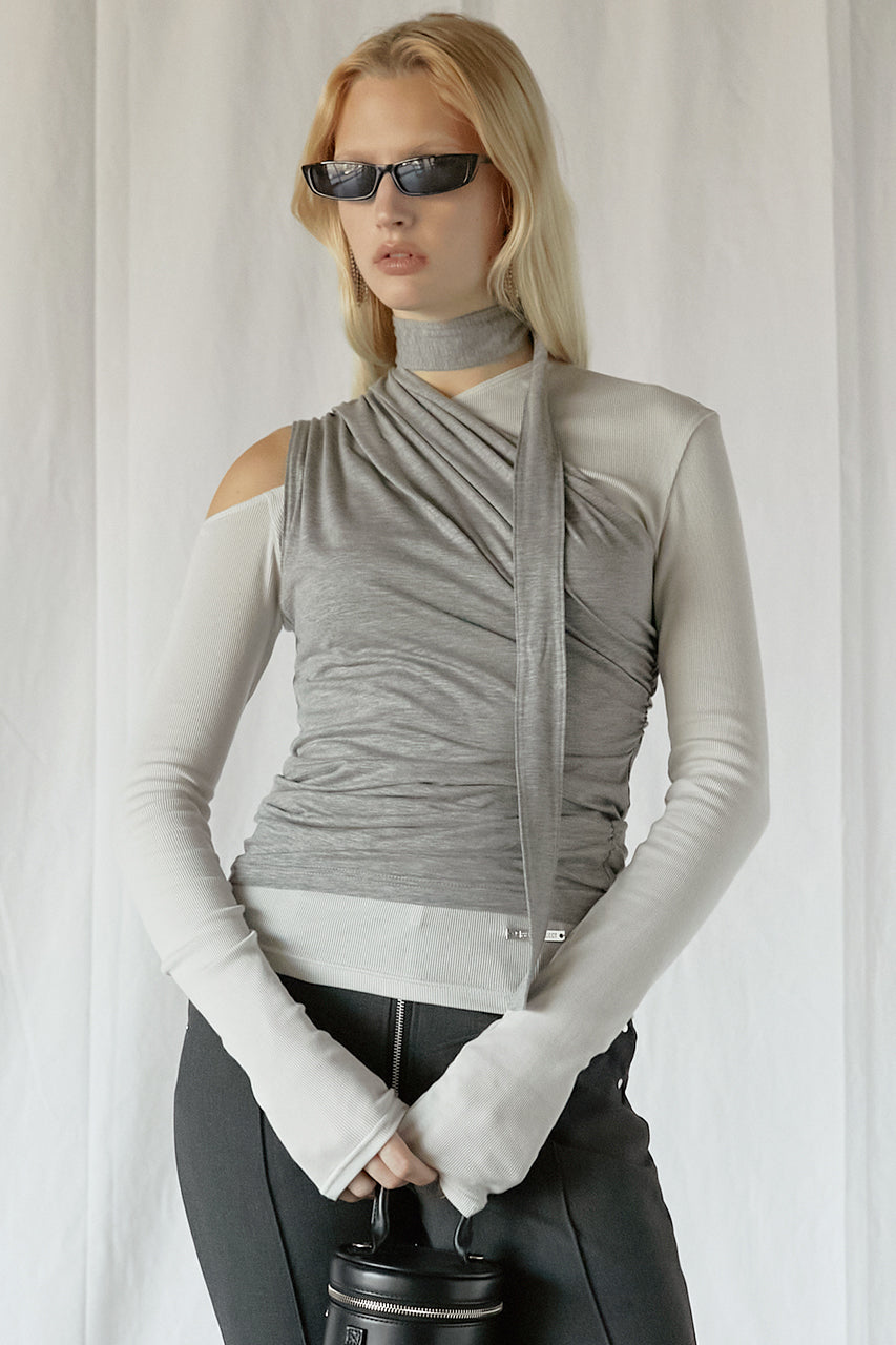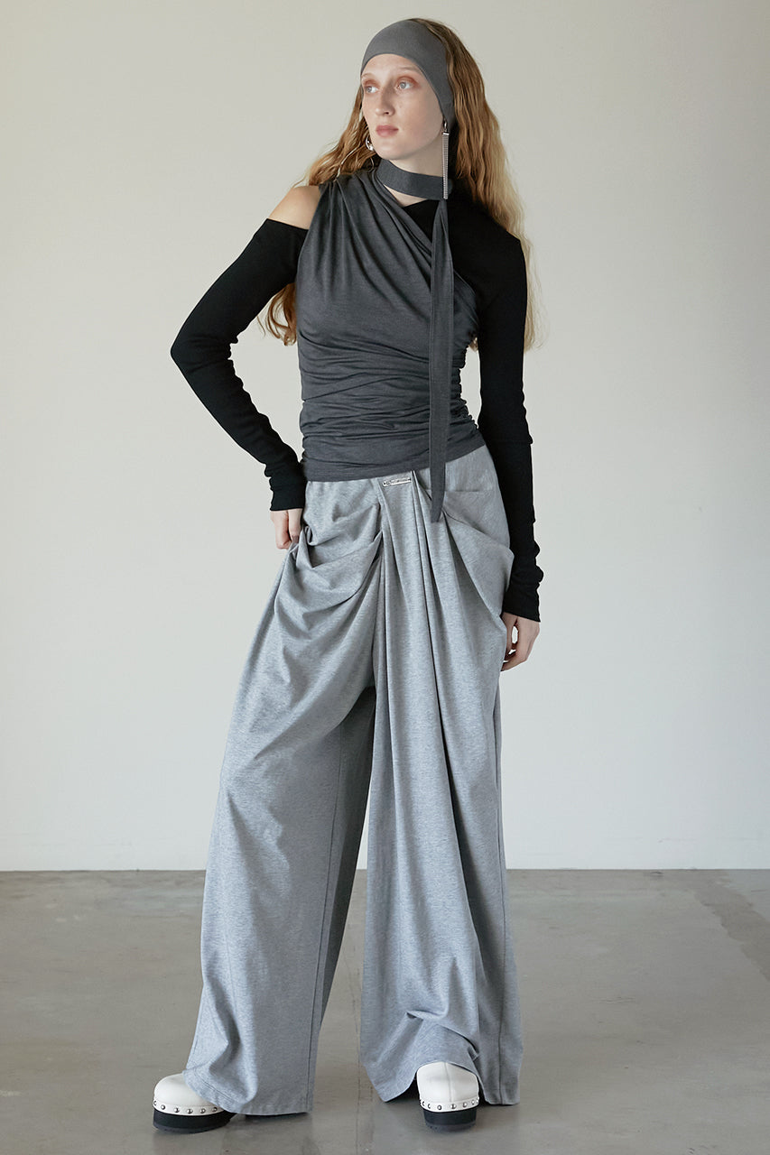 アシンメトリーなネックのロングスリーブとたっぷりとギャザーの入ったタンクの3ピースセットアイテム。