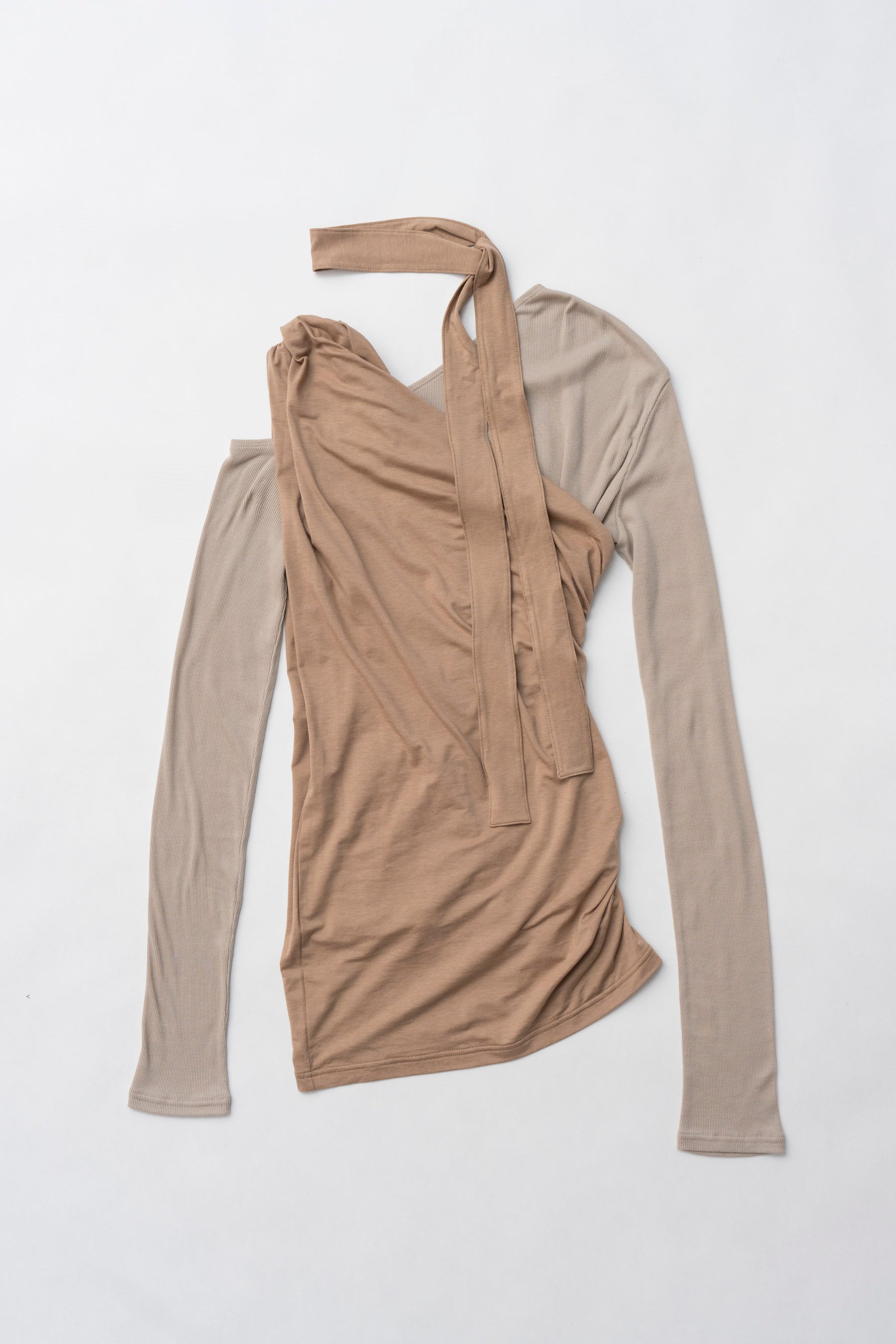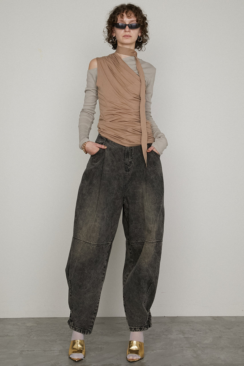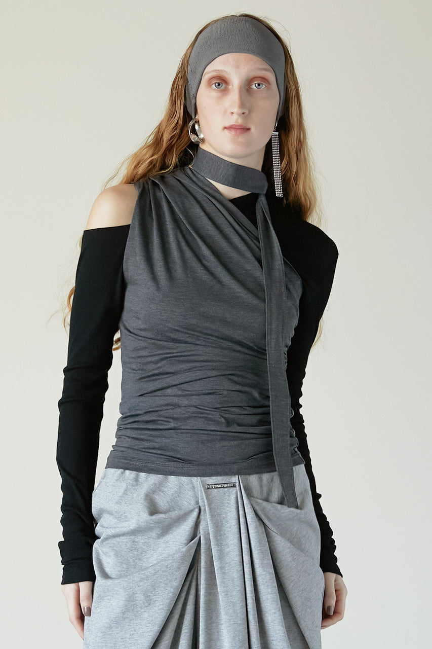 アシンメトリーなネックのロングスリーブとたっぷりとギャザーの入ったタンクの3ピースセットアイテム。