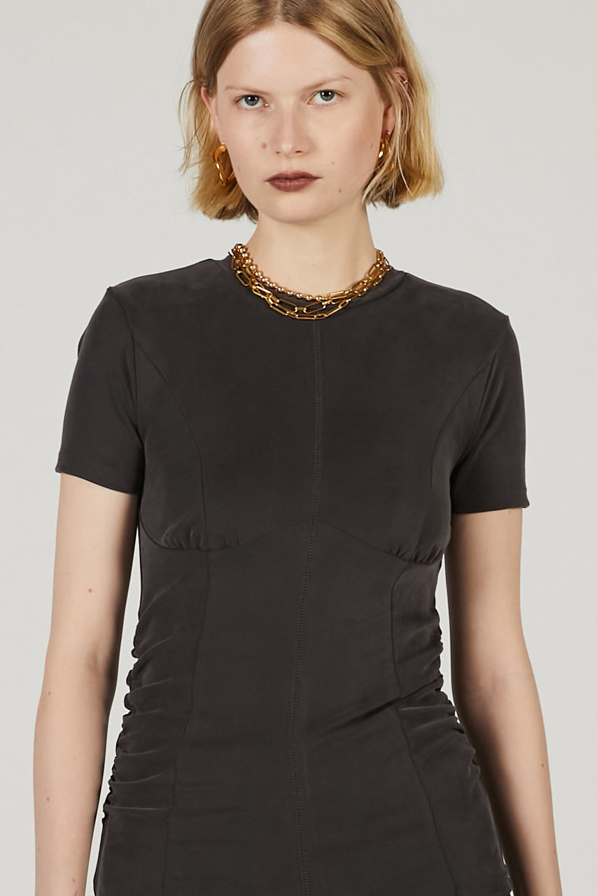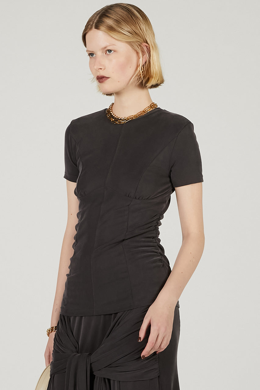 体のラインに沿ったシーム使いで、シンプルながら女性らしさを感じるTシャツ。