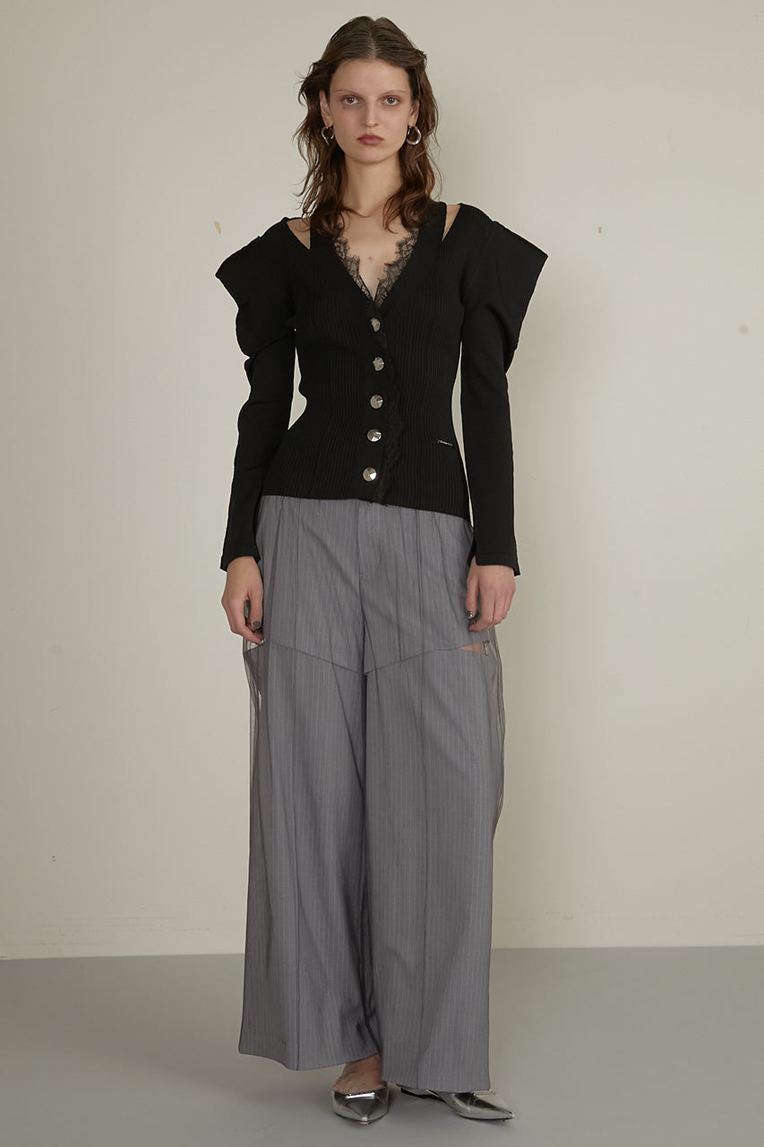 スラックス全体をチュールですっぽりと包んだ様なユニークなディテールが特徴的なボトム。