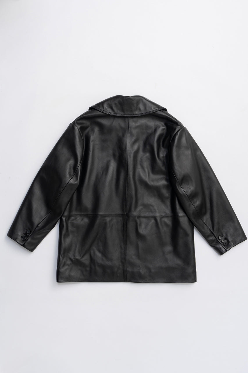 ビッグカラーが特徴的な本革のジャケットコート。