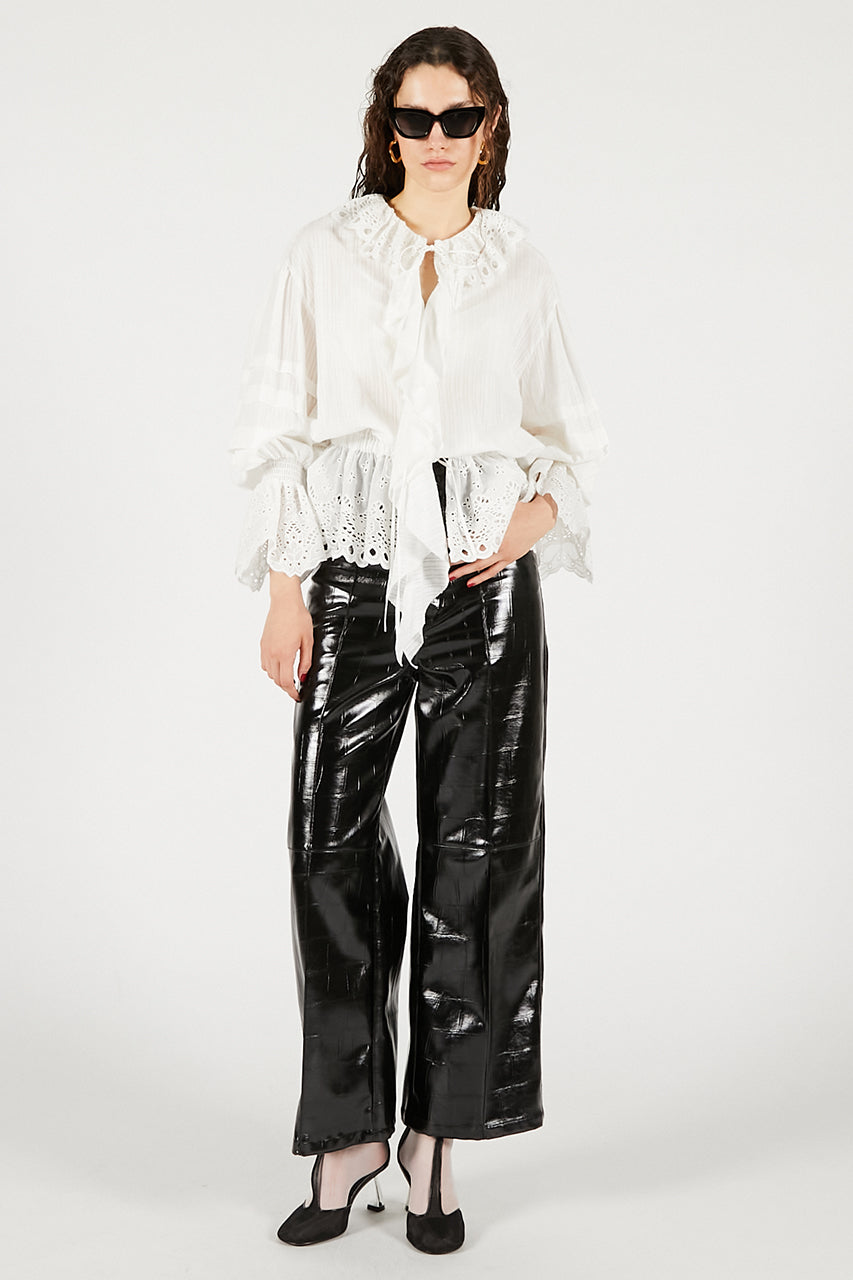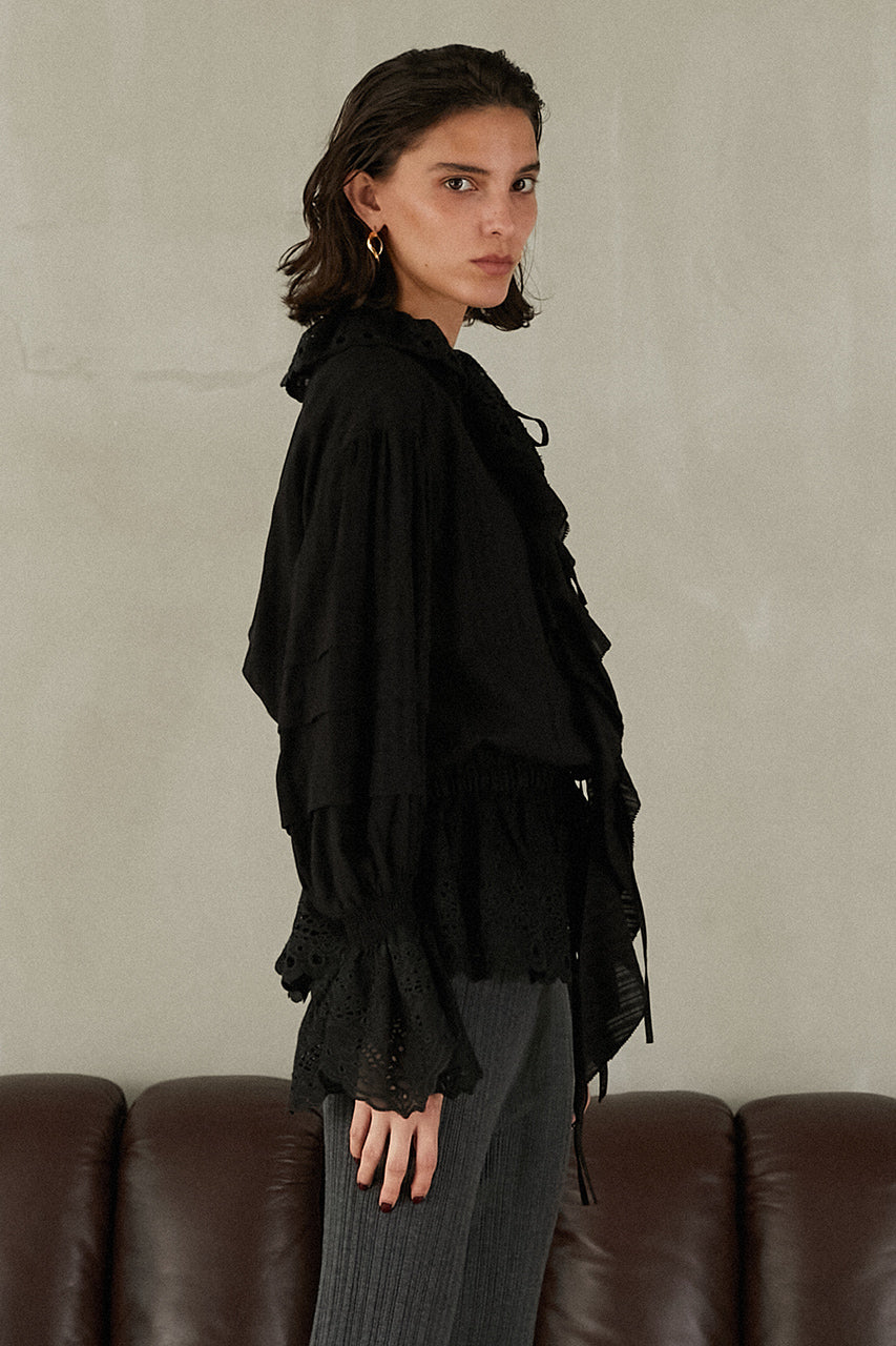 身頃にはドビーストライプのコットン生地、フリル部分にはオリジナルの刺繍を施した透け感のあるコットンボイルを使用。