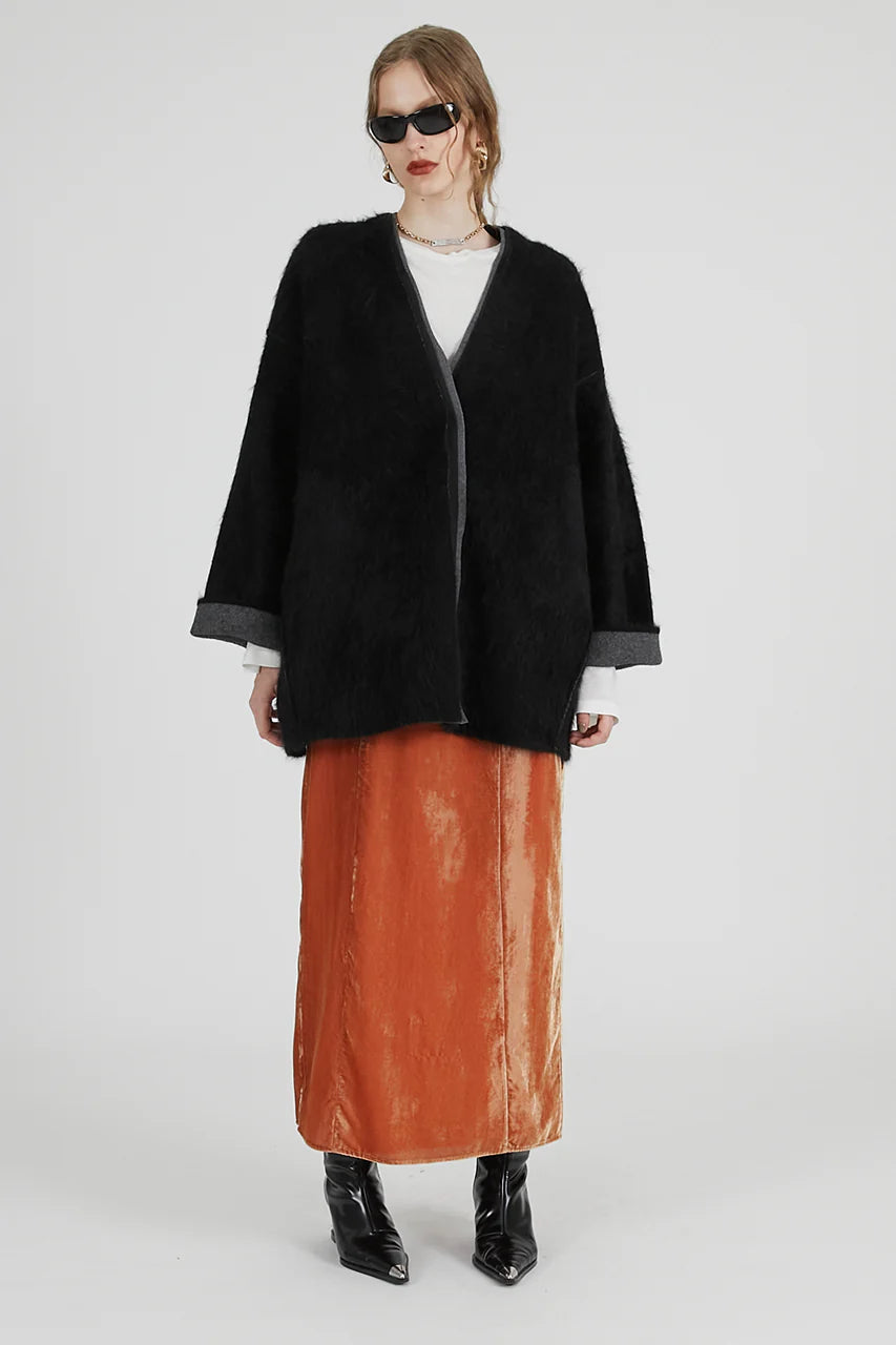 上質で繊細なアルパカ糸に、ハリのあるポリエステルを組み合わせることで立体的なコクーンシルエットに仕上げている。