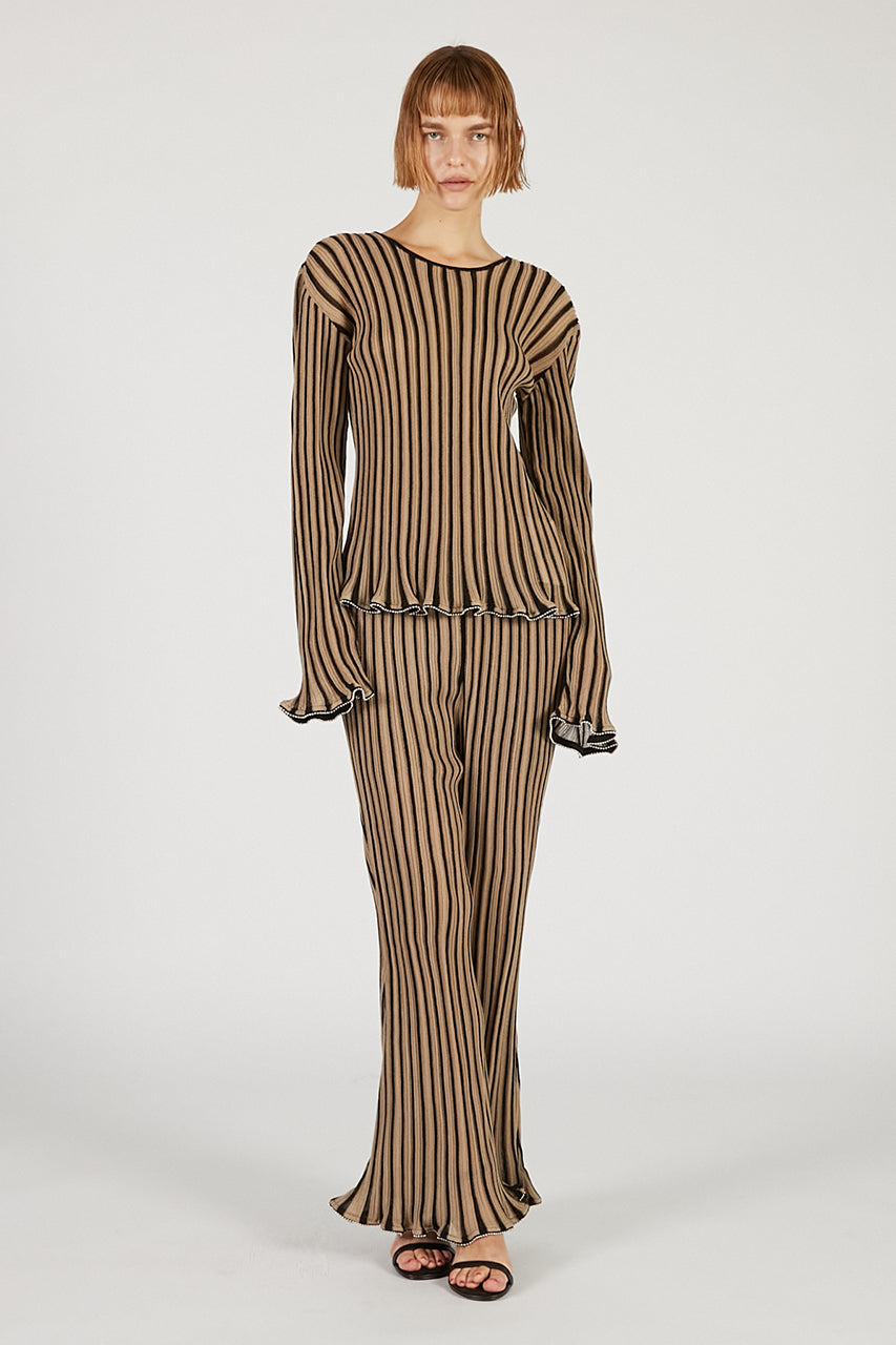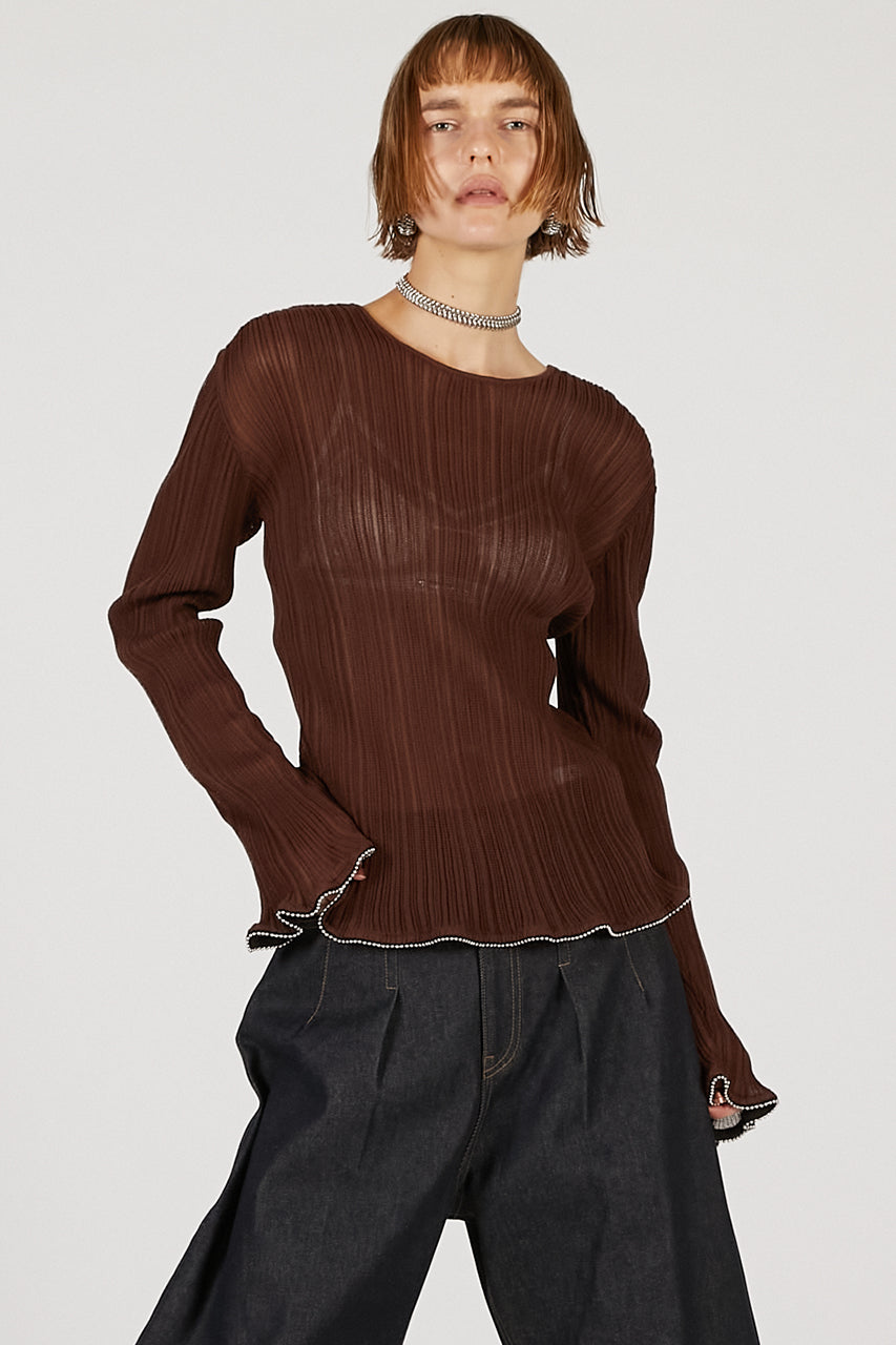シンプルながらニットにプリーツ風の編地で、縦のラインが強調されて、体を美しく見せてくれる。