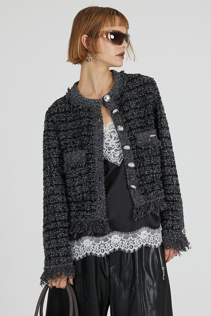 さりげないチェック柄に編み上げたコンパクトなサイズ感のカーディガン。