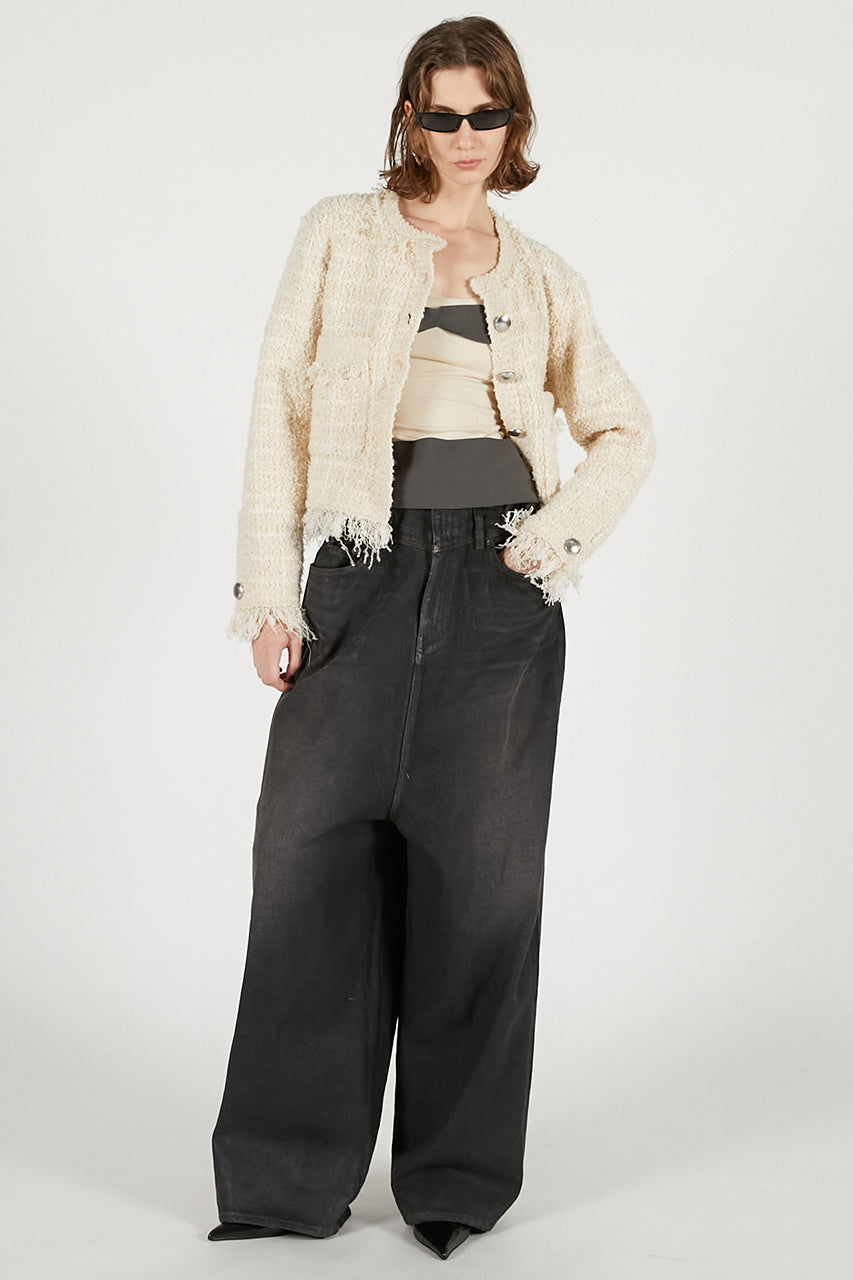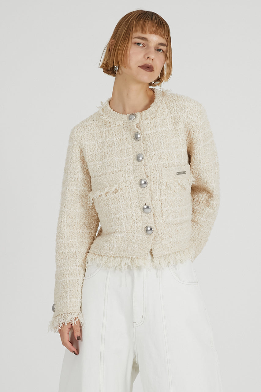 テープヤーンとブークレ糸を組み合わせてツイードのように編んだニット地。