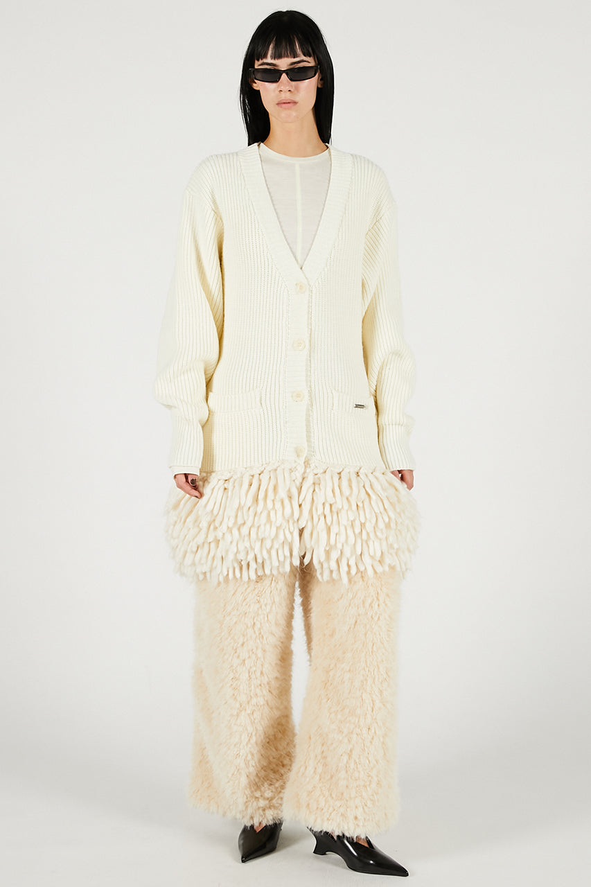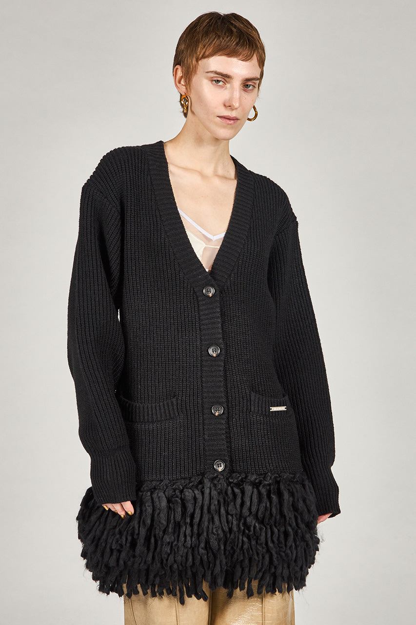 手仕事ならではの大胆なフリンジ使いが印象的なニットカーディガン。