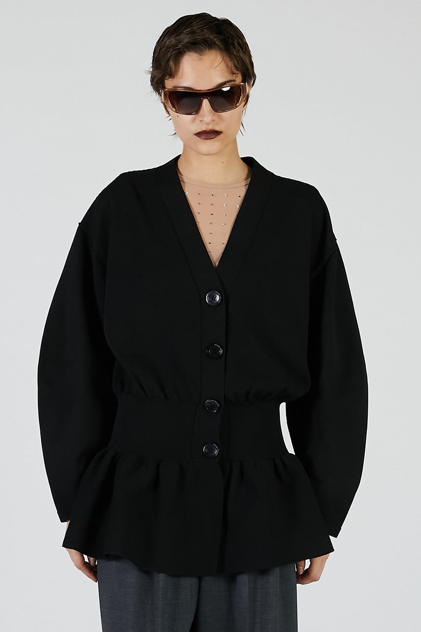 ローウエスト位置から張り出るぺプラムと構築的なコクーンスリーブが特徴のフォルム感にこだわったニットカーデ。