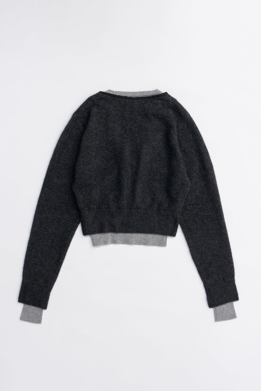 1枚でレイヤードスタイルが完成する、レイヤード風カーディガン。