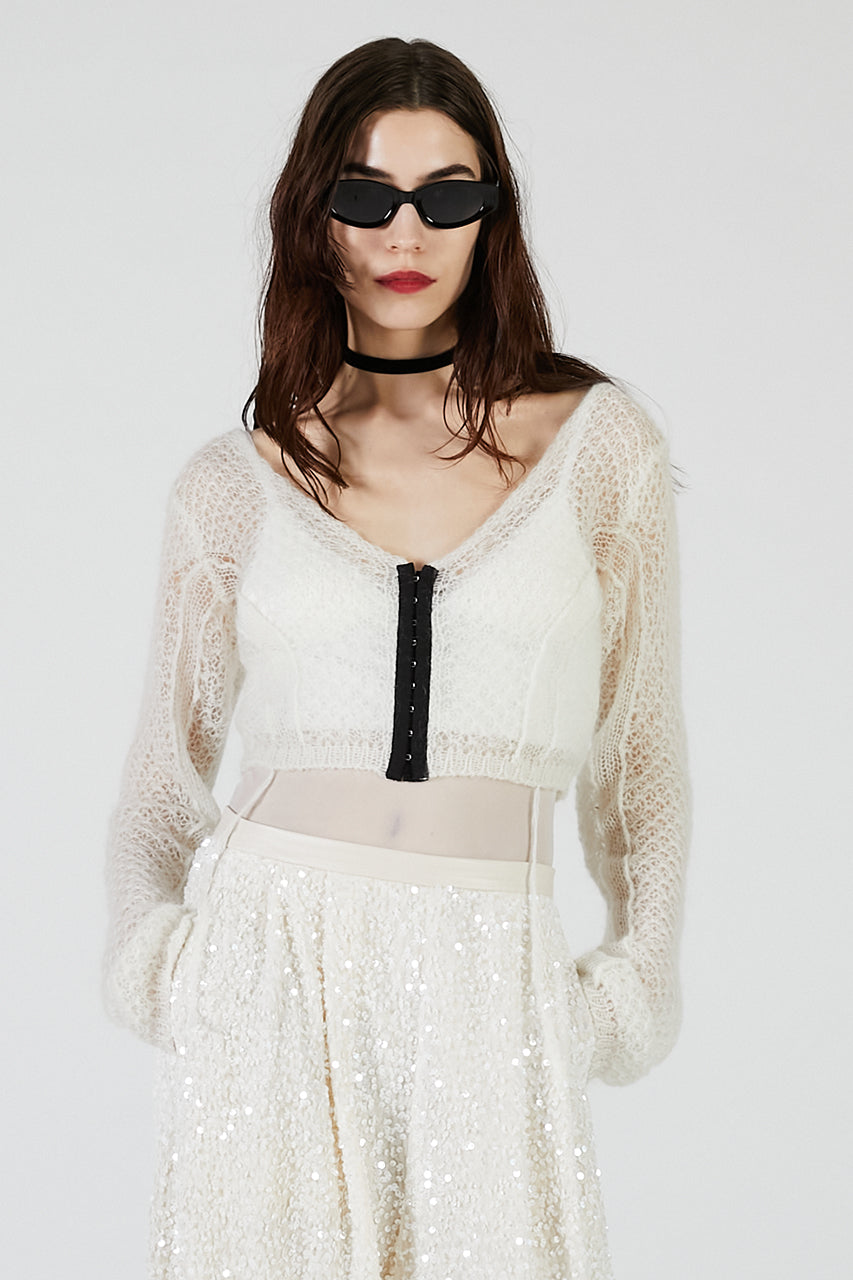 柄メッシュ編みの表情がポイントのニットカーデ。繊細なボディにフロントホックでメタルのアクセントが効いています。ショート丈なのでボリューミーなボトムとの相性よく、スタイルアップ効果も◎