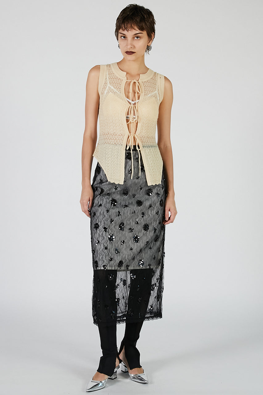 モヘアの柔らかな質感とシアーコントラストがポイントのニットトップ。前後で着用可能な2way仕様。フロントのリボンを開ければ羽織りとしても着ていただけるデザイン。ノースリーブなので晩夏から着用でき、ジャケットのインナーやTシャツとのレイヤードもおすすめ。発色の良いカラーリングでシーズンムードを高めてくれる一着。
