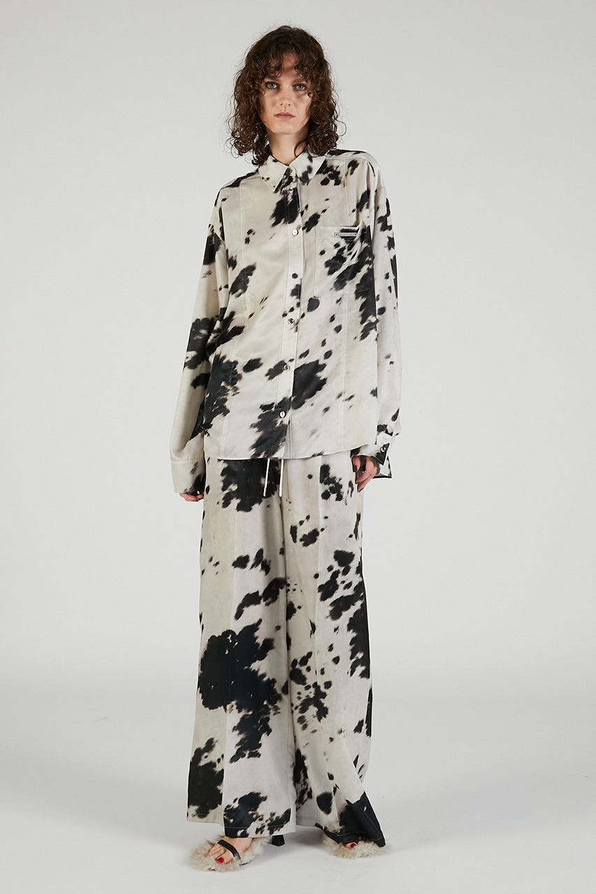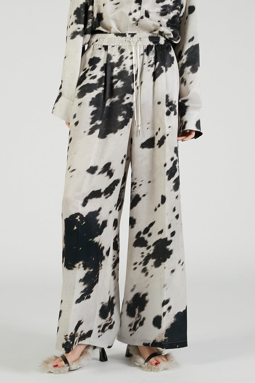 リアルに描いたハラコ柄プリントが印象的なワイドパンツ。