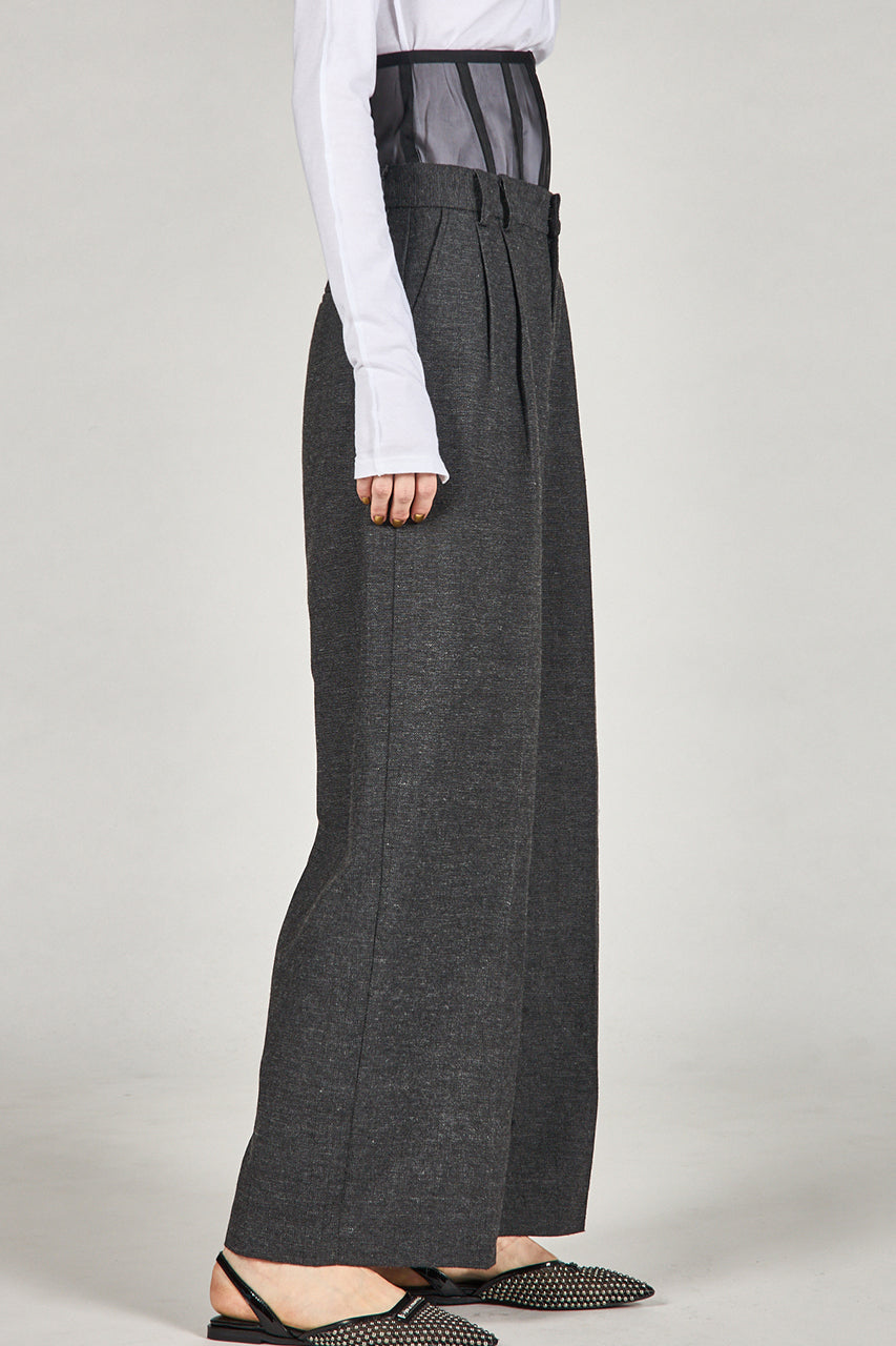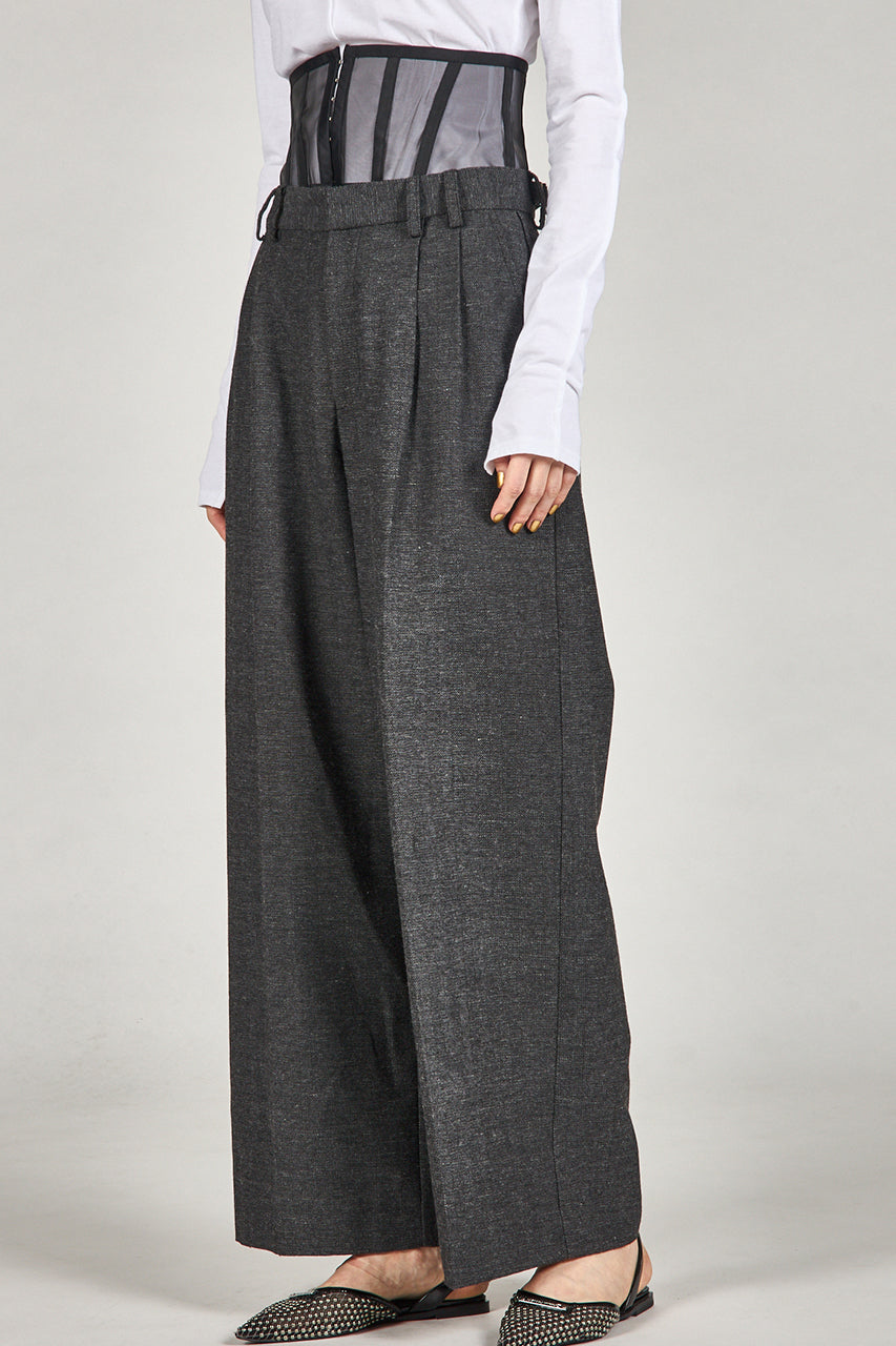 ハードチュールで作られたコルセットは透け感があり、パンツとのコントラストがポイント。
