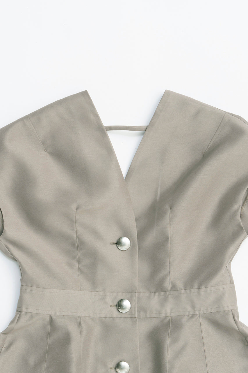 Vネックと着用するとより構築的なシルエットになるウエストのシェイプがスタイルアップ効果◎