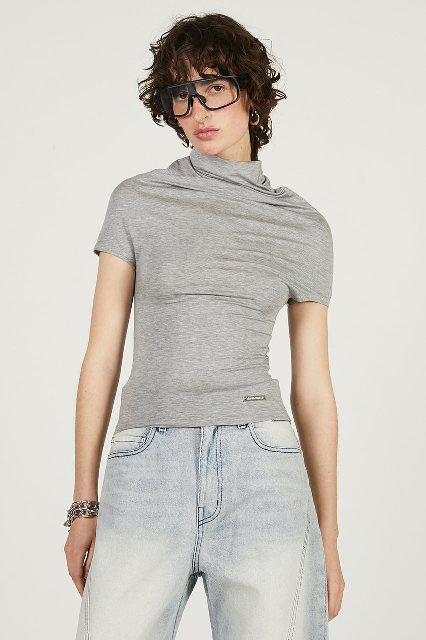 カウルネックのネックラインがポイントのミニマルなカットソー。