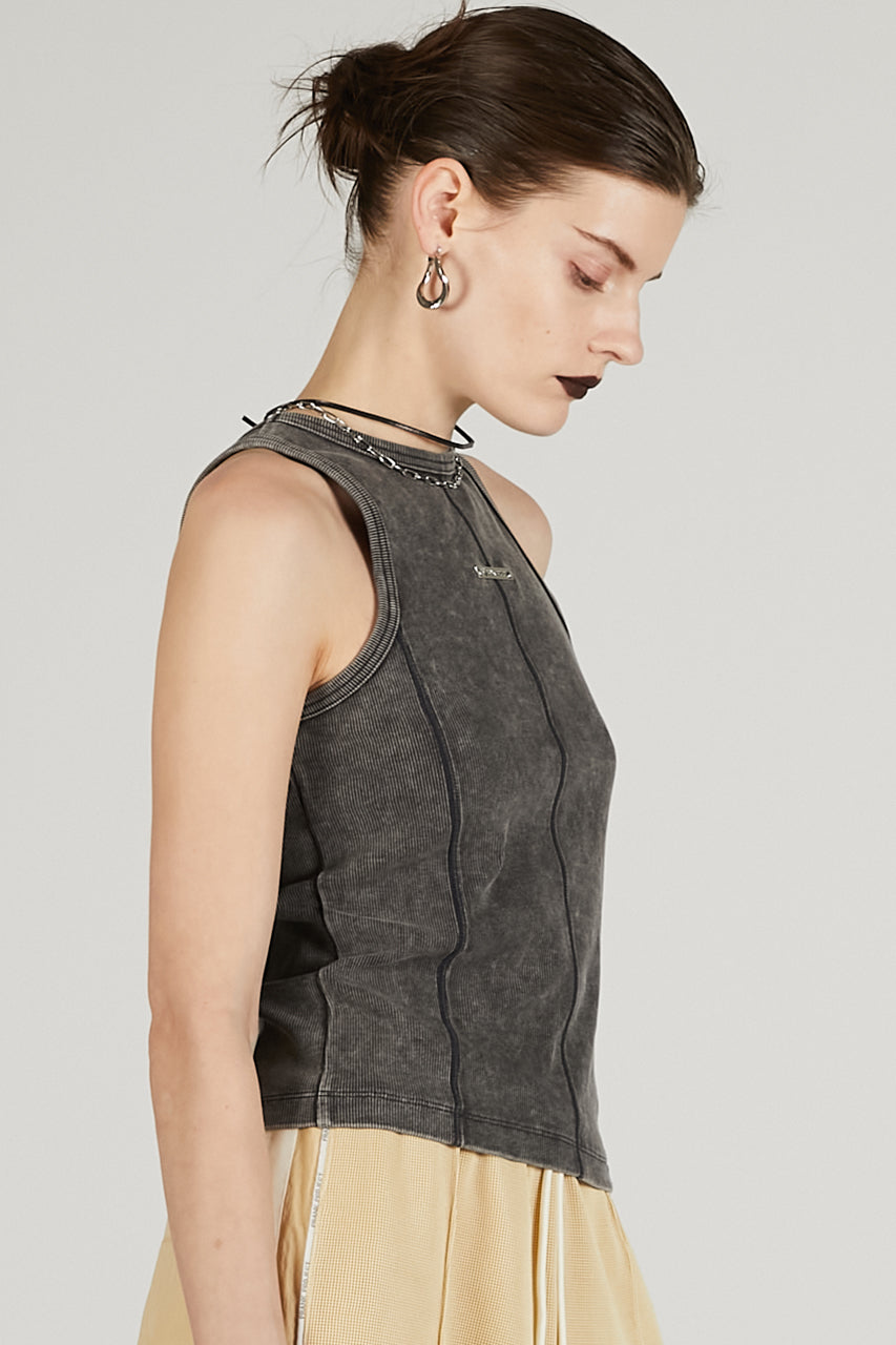ネックの空き具合が前後で異なり、プレートが付いてる面と裾にフックアイテープが付いているデザインが特徴。