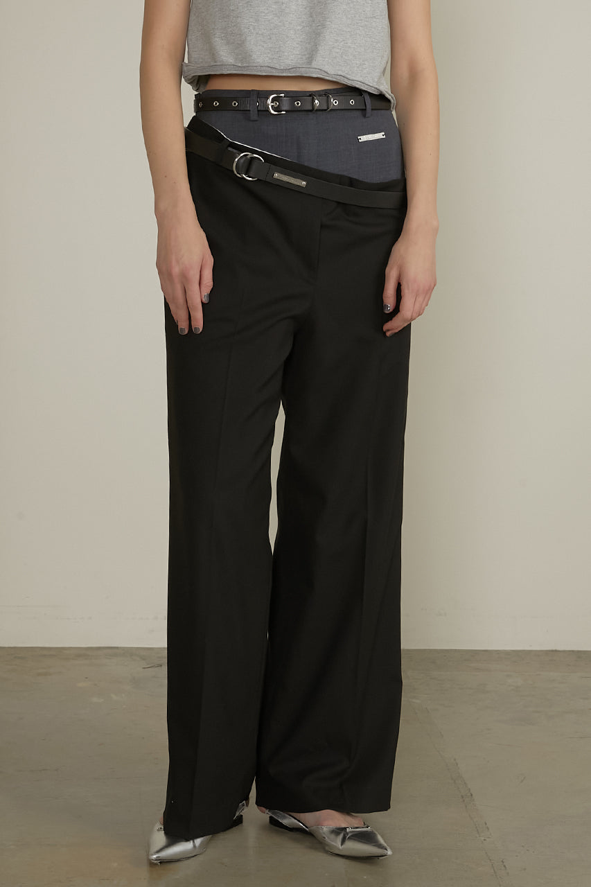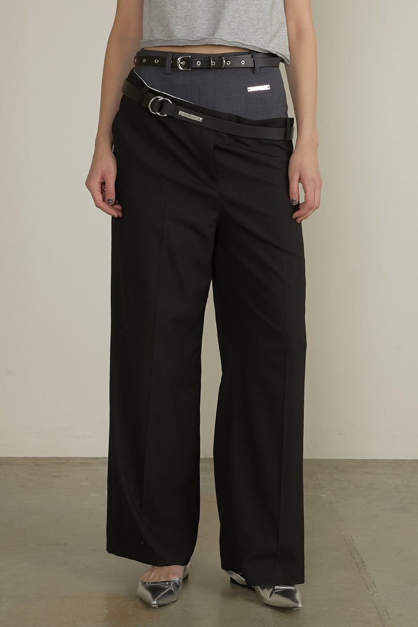 2枚のスラックスを重ね着したようなデザインパンツ。