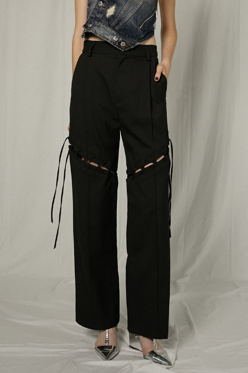 きれいめのスラックスに肌見せのカットアウトとレースアップを施したパンツ。