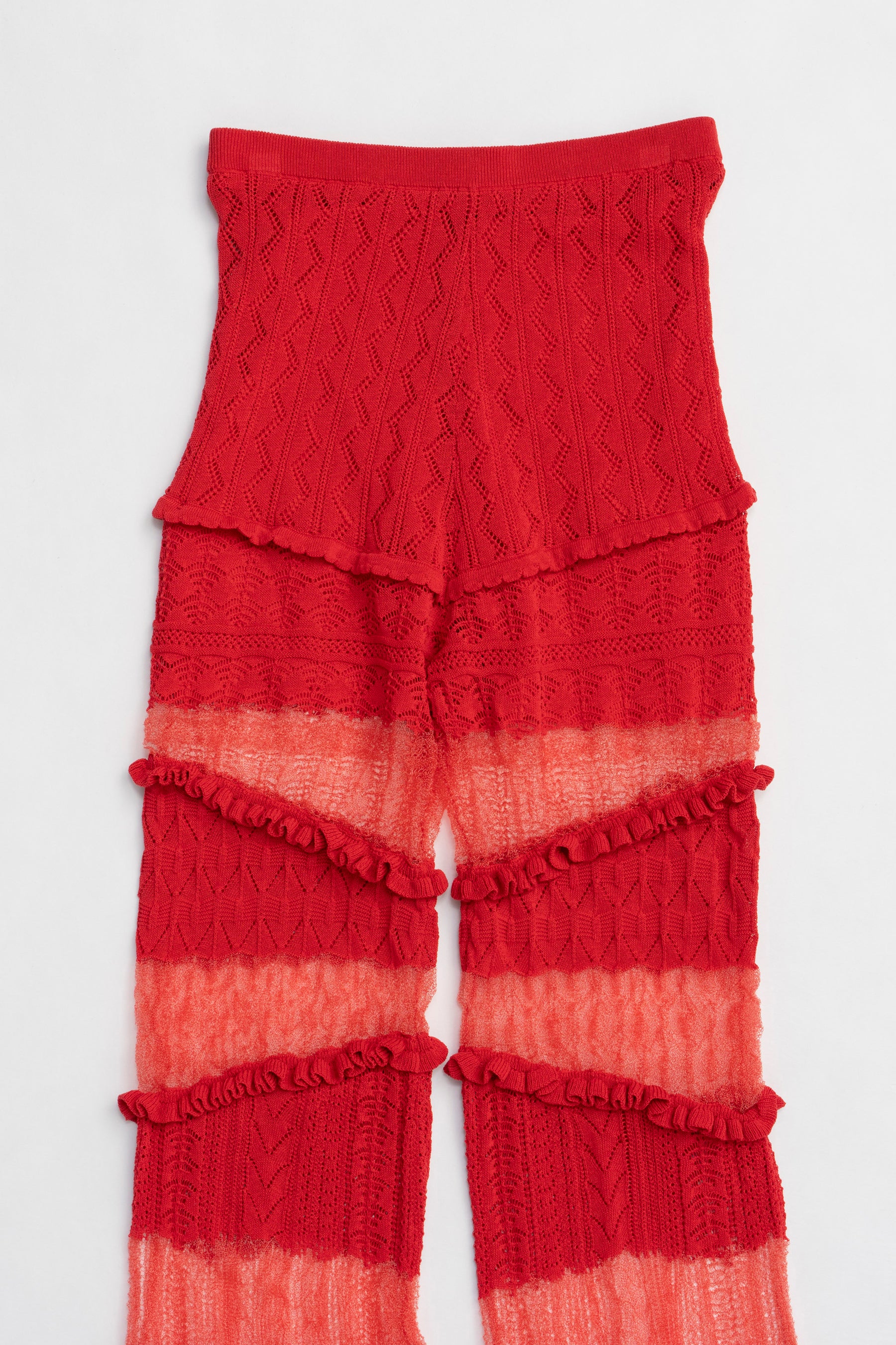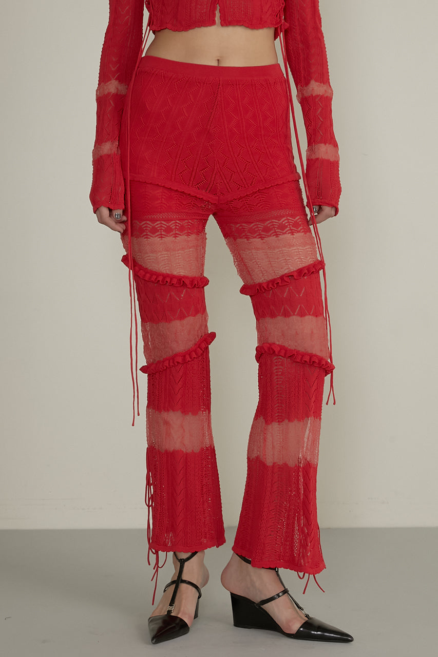 様々なパターンのレース柄を組み合わせたニットパンツ。