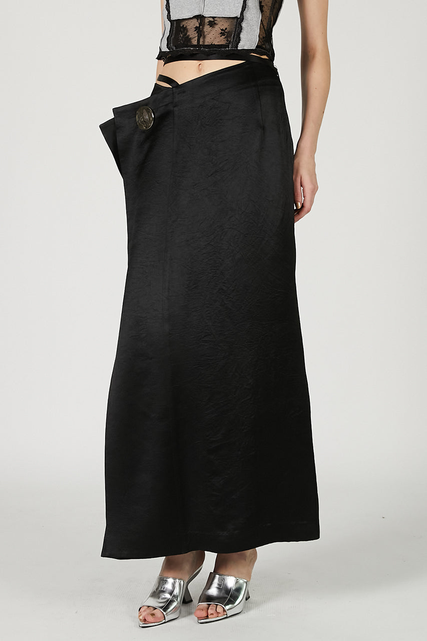 脇に張り出したヒダとローウエストがポイントの構築的なマキシスカート。