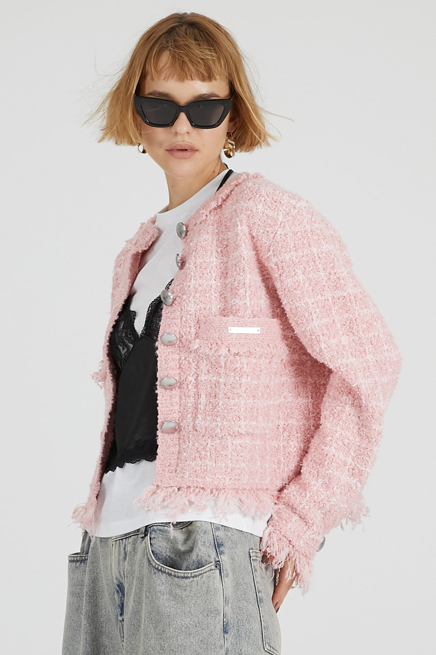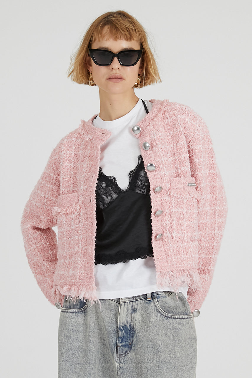 さりげないチェック柄に編み上げたコンパクトなサイズ感のカーディガン。