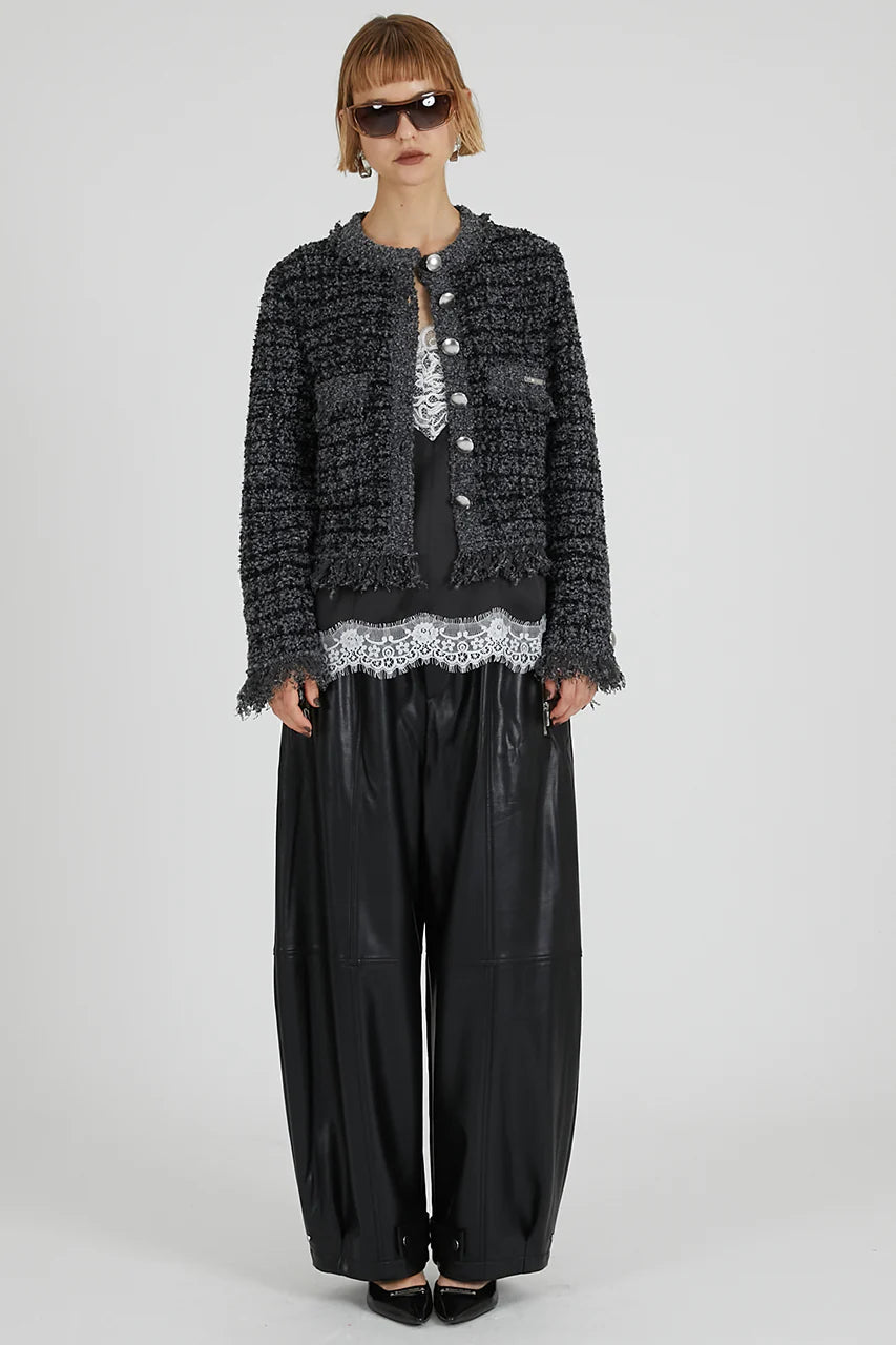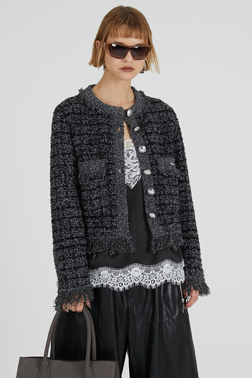 テープヤーンとブークレ糸を組み合わせてツイードのように編んだニット地。