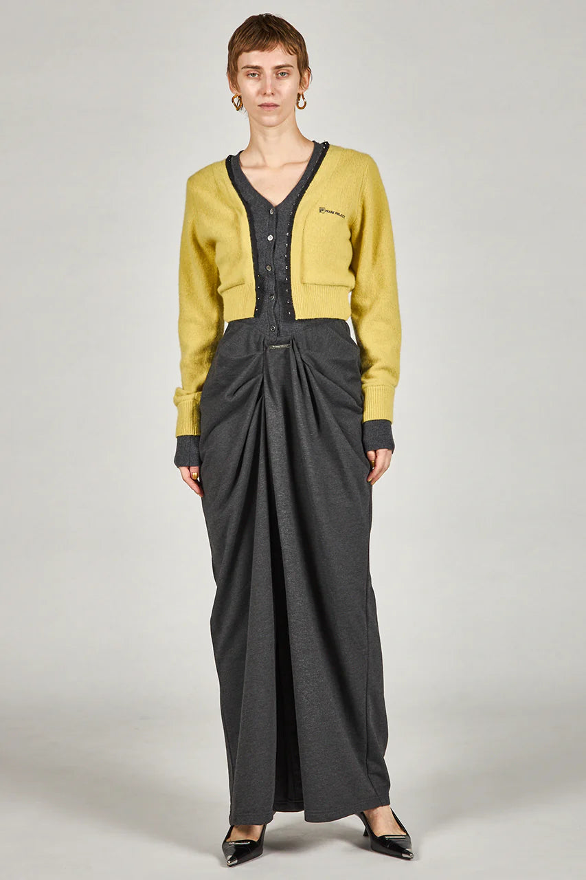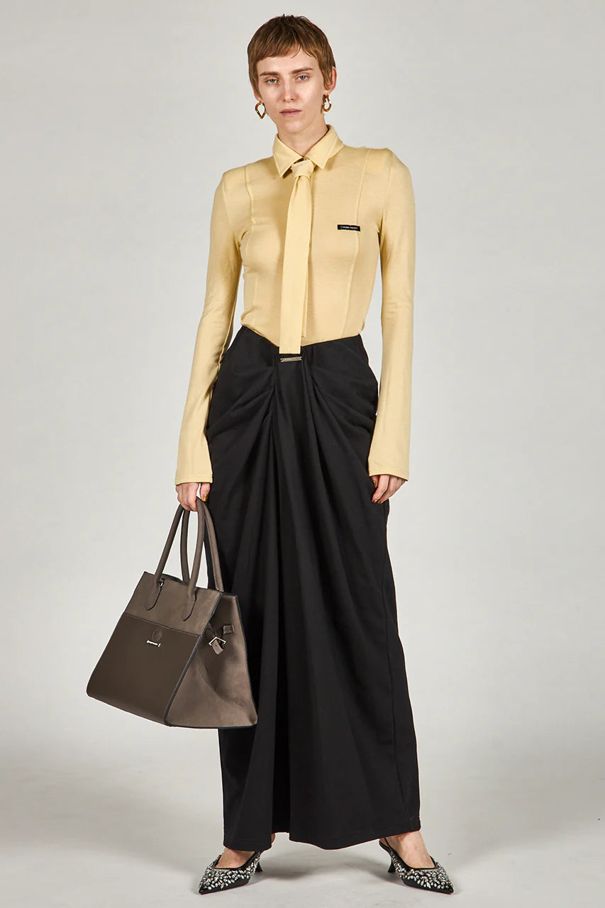 一見スカートにも見えるエレガントなデザインをカットソー生地に落とし込んだ意外性のある一枚。