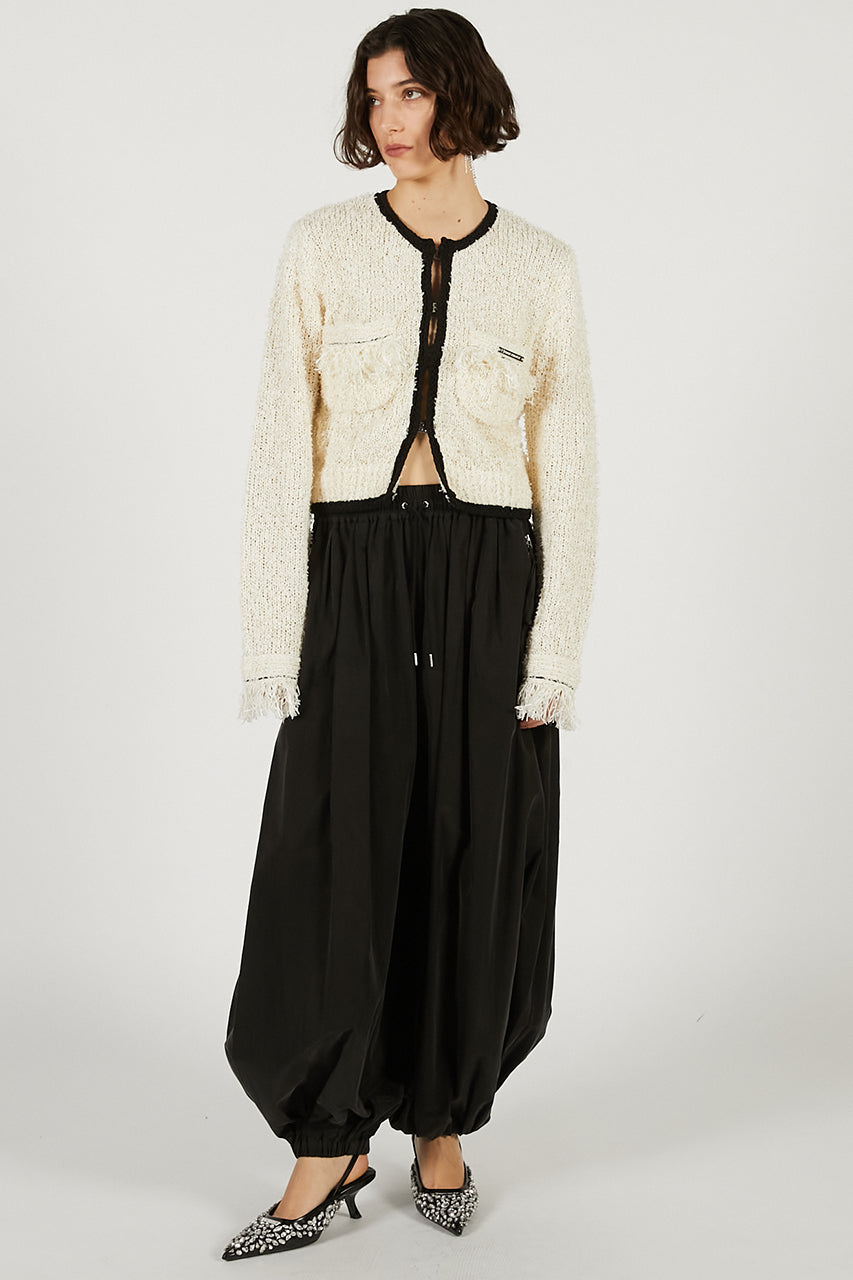 メタルチャームをフロントに施したコンパクトなサイズ感のニットジャケット。ニットならではの伸縮性と肌馴染みの良さがありつつも上品な印象に仕上げている。スタイリング次第でオンオフ問わず様々なシーンで活用できる一着。デニムやハーフパンツなどのカジュアルなアイテムに合わせても品の良さをひき出してくれるアイテム。